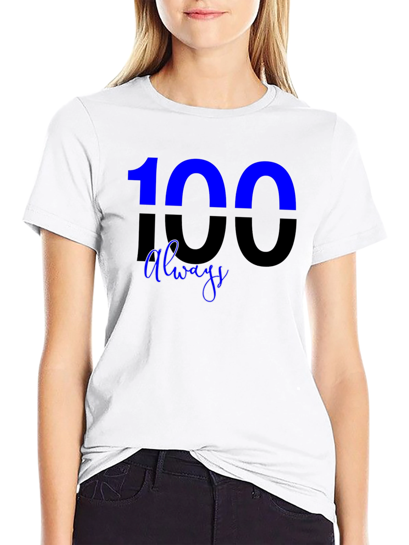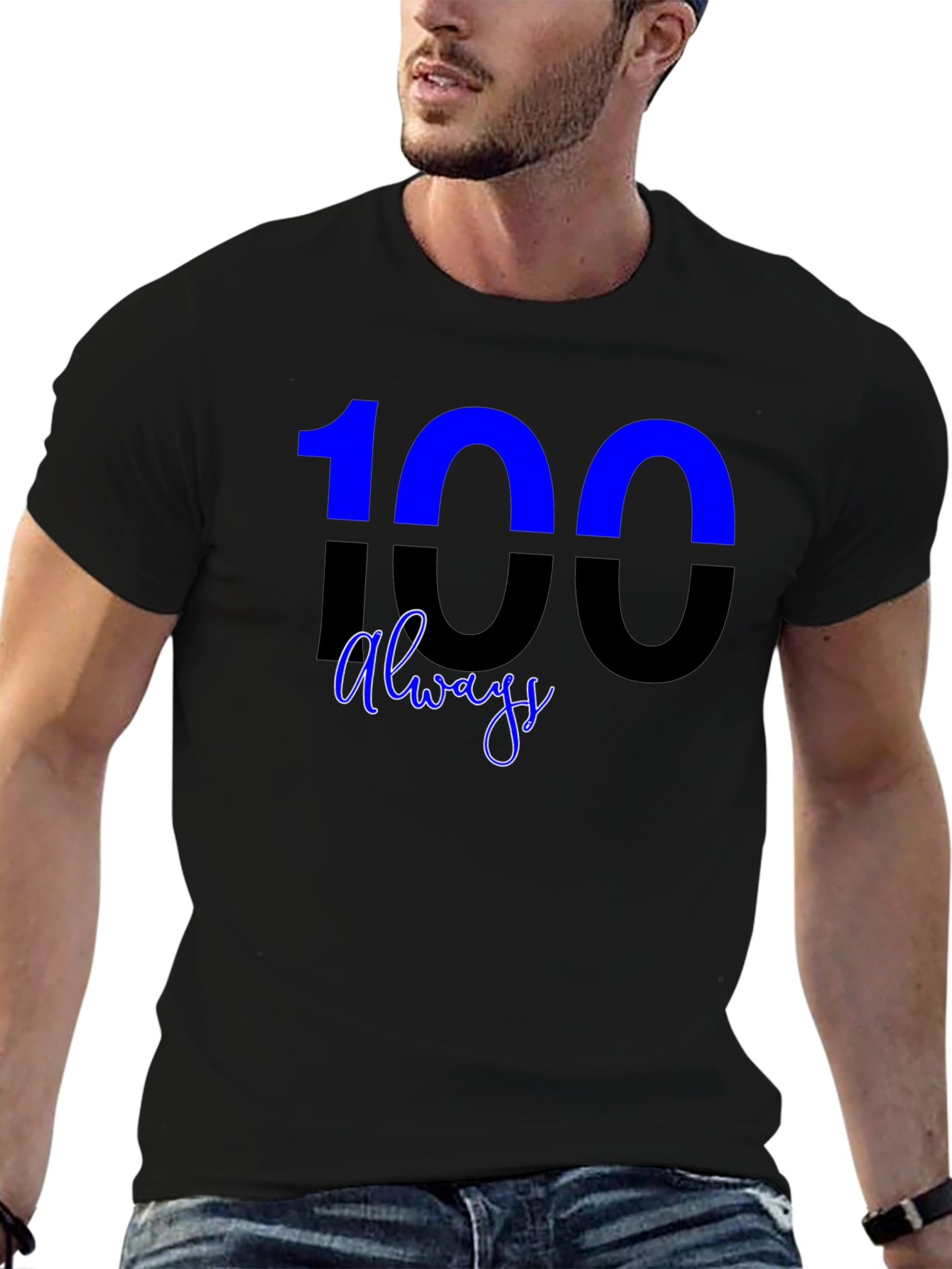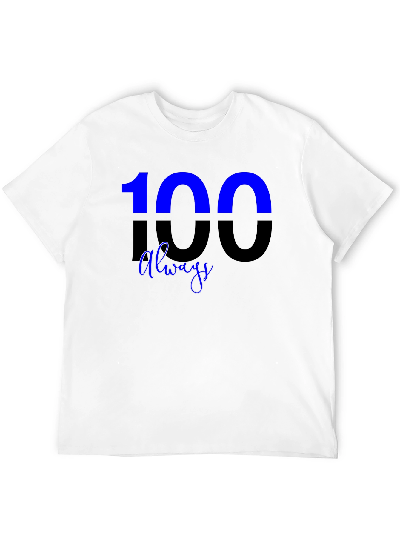 Showcase your unique style with this eye-catching graphic t-shirt. The design features a bold "100" with a unique color split and "always" script, making a statement. Crafted from a soft, comfortable fabric, this tee is perfect for everyday wear. The classic crew neck and short sleeves offer a relaxed fit, while the durable construction ensures long-lasting quality. Whether you're hanging out with friends, running errands, or just relaxing at home, this t-shirt will keep you looking and feeling great. Pair it with jeans, shorts, or joggers for a versatile, casual look. Express yourself with this stylish and comfortable tee!