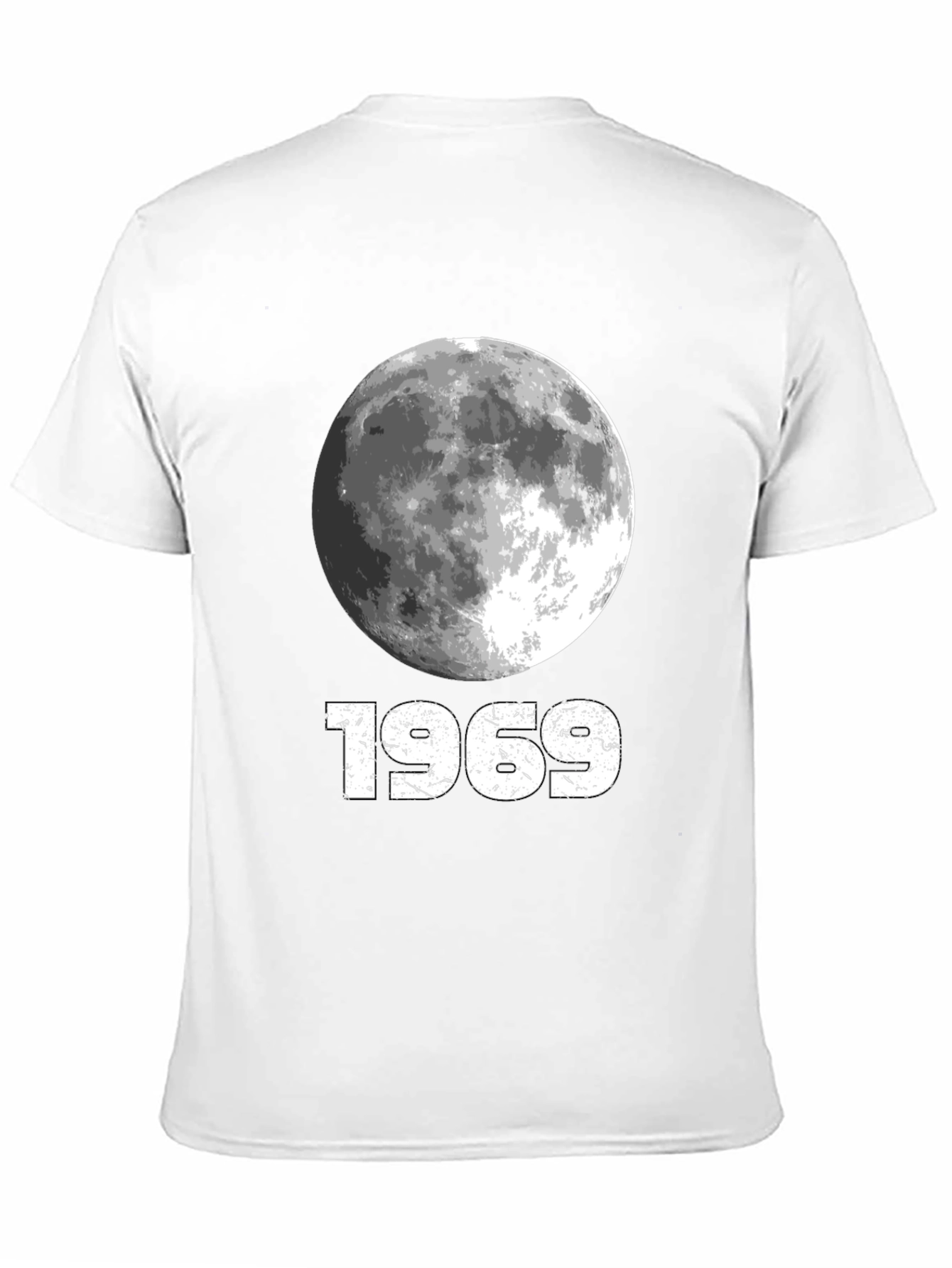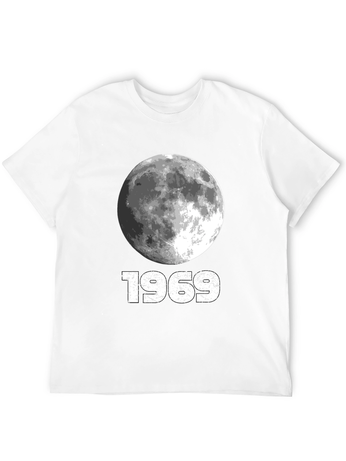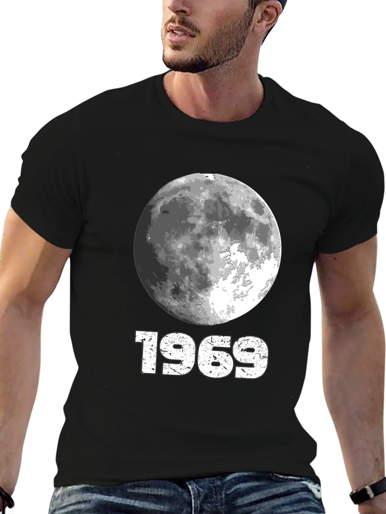 Celebrate space exploration with this classic black T-shirt featuring a detailed moon graphic and the iconic year '1969'. Made from comfortable, breathable fabric, this tee is perfect for casual wear. The vintage-inspired design adds a touch of retro cool to any outfit. Ideal for space enthusiasts and history buffs alike. Show your love for the Apollo 11 mission with this stylish and timeless piece. Dress it up with a jacket or wear it on its own for a relaxed, effortless look.