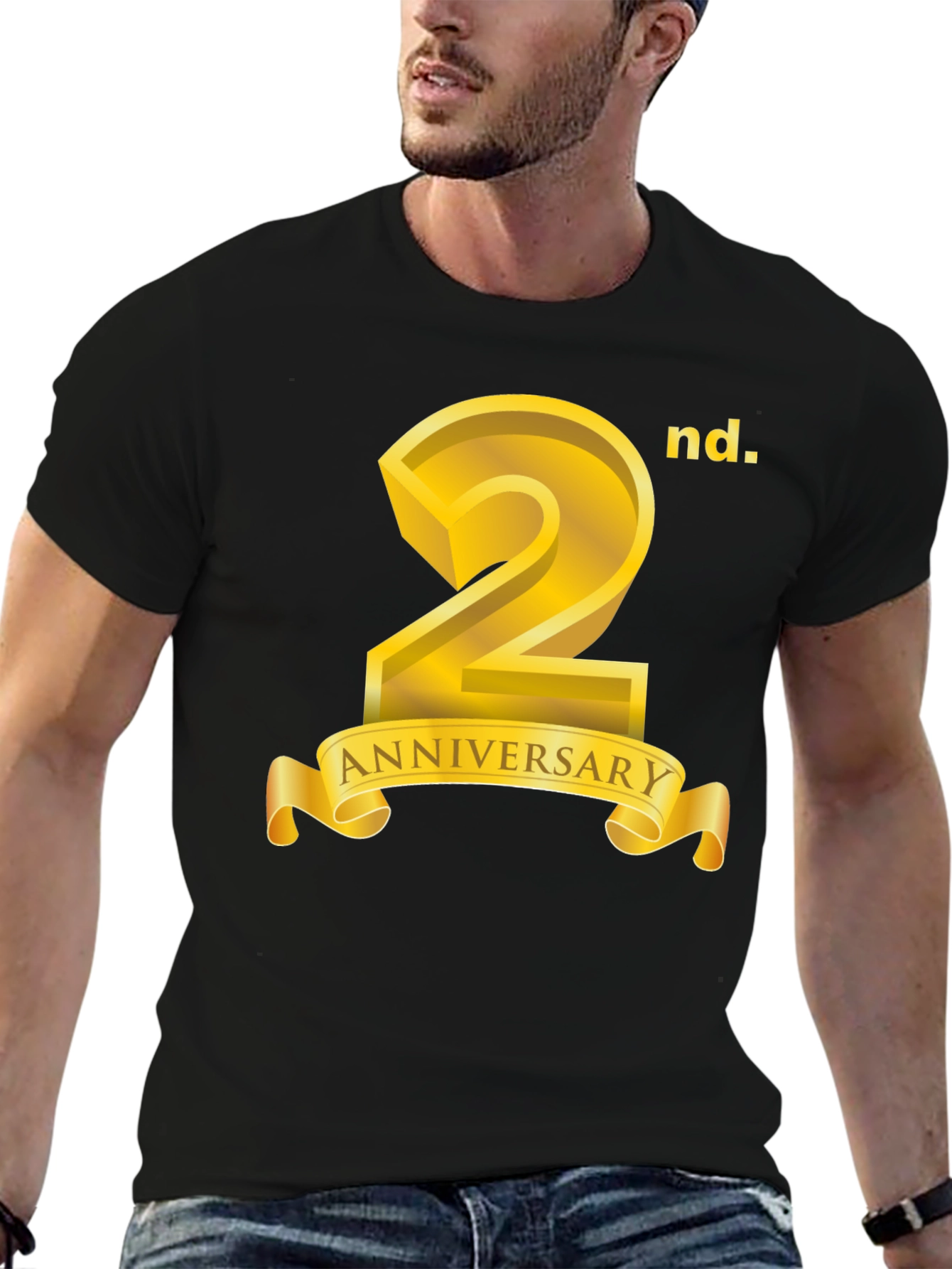 Celebrate a second milestone with this eye-catching black t-shirt! This shirt features a bold, golden "2nd" design that is perfect for an anniversary. The words "ANNIVERSARY" are displayed on a golden ribbon. The design is vibrant and looks like a high-quality print. Made from comfortable material, this tee is suitable for everyday wear or special occasions. Show your love and commitment with this unique garment. Ideal for anniversary parties or as a thoughtful gift. Grab yours today and commemorate the second year!