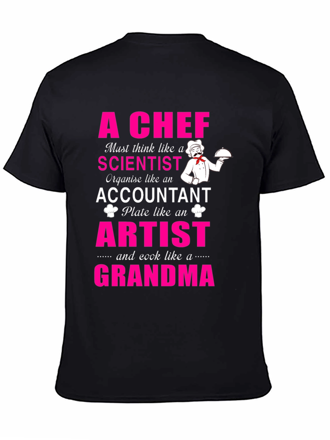 This black T-shirt features a unique design for chefs. In bold pink letters it states, 'A CHEF Must think like a SCIENTIST Organise like an ACCOUNTANT Plate like an ARTIST and cook like a GRANDMA' along with a chef illustration. The shirt is perfect for chefs who appreciate humor and value the diverse skills required in their profession. It's a great way to express your passion for cooking and show off your culinary expertise with a touch of grandmotherly love.