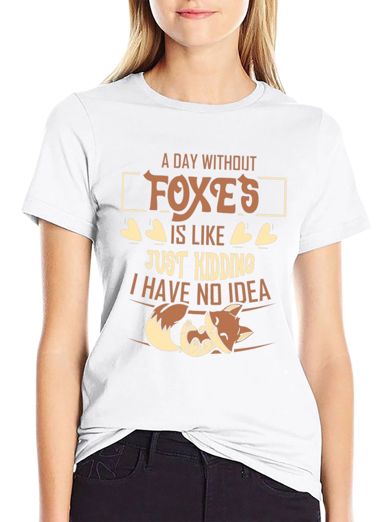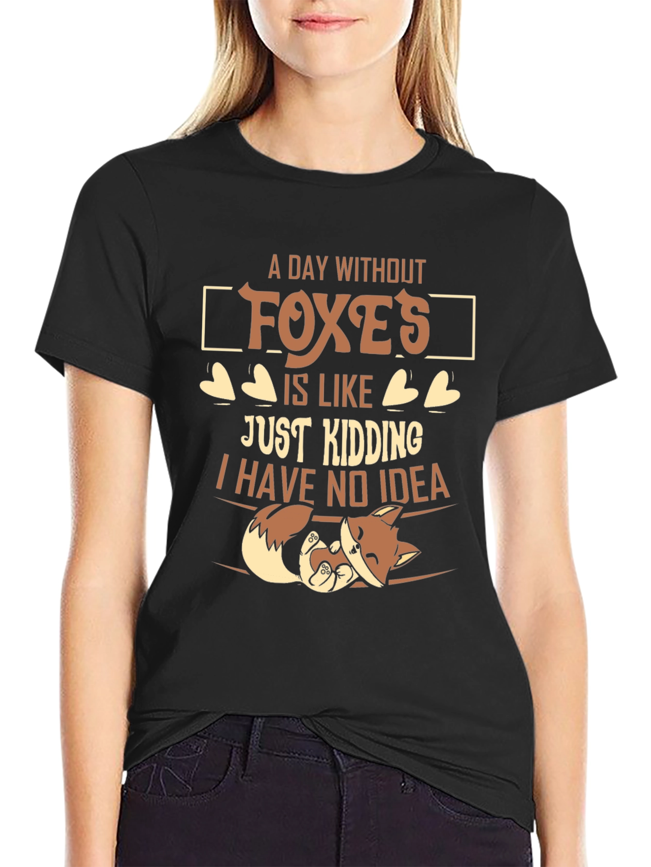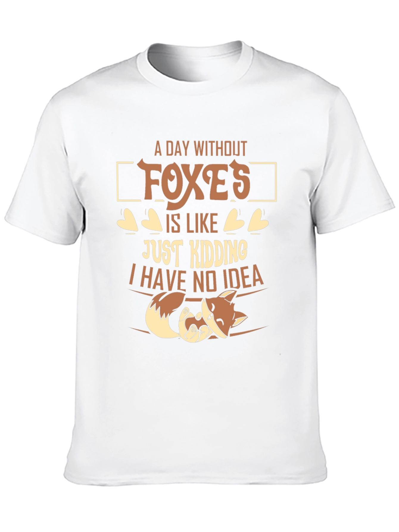 Show off your love for foxes with this fun and unique t-shirt. This black t-shirt features a playful design with the phrase "A day without foxes is like...just kidding I have no idea" accompanied by a cute cartoon fox. The humorous text and adorable fox graphic make it a great conversation starter and a fun way to express your personality. Made from comfortable material, this t-shirt is perfect for casual wear, whether you're lounging at home, running errands, or hanging out with friends. It is bound to be a favorite for fox lovers!