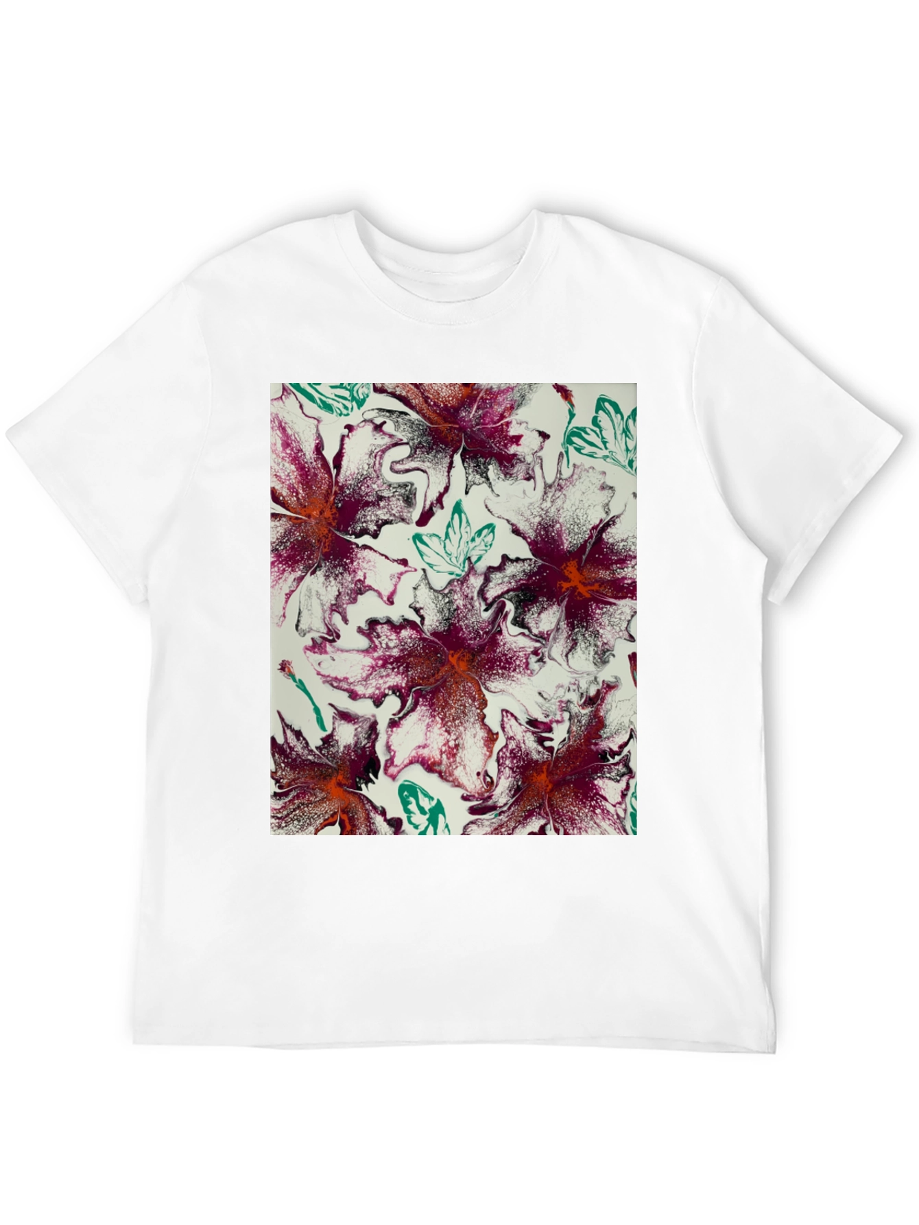 Elevate your wardrobe with this unique black t-shirt featuring an eye-catching abstract floral design. The shirt showcases a vibrant pattern of abstract maroon and white flowers with hints of green leaves, creating a visually stunning and artistic look. Made from a comfortable-looking material, this tee is perfect for everyday wear or as a standout piece for casual outings. Its modern design and comfortable fit make it a versatile addition to any wardrobe. Show off your unique style with this must-have t-shirt that's sure to turn heads.