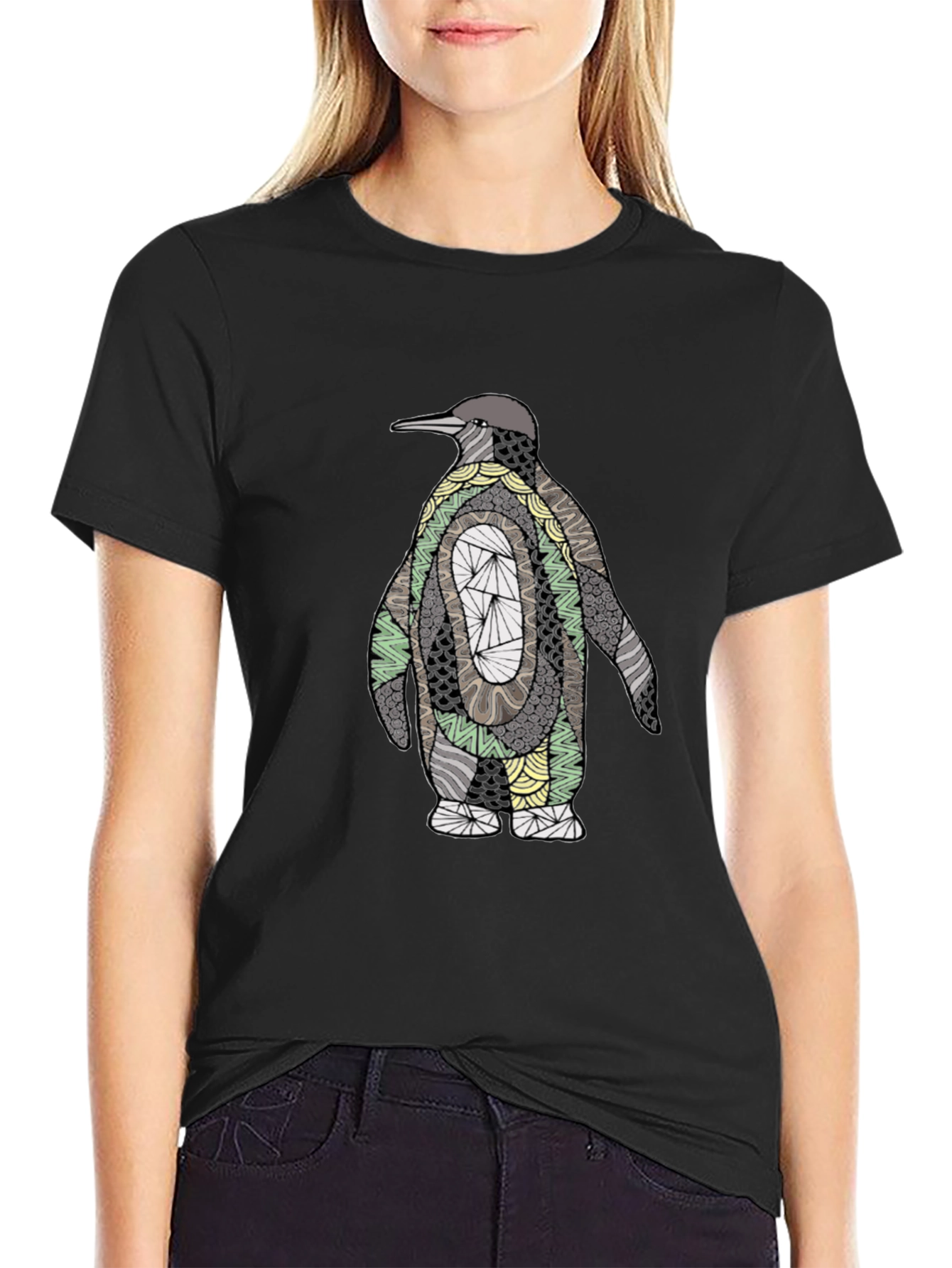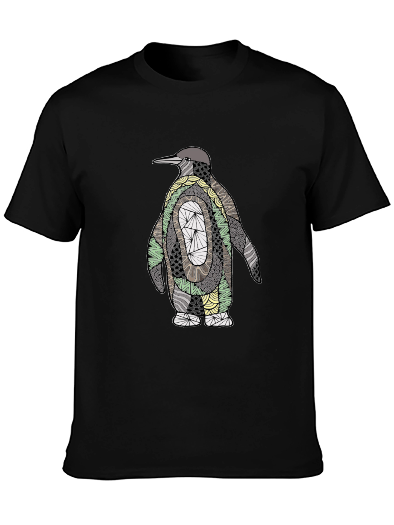 This black t-shirt features an eye-catching, abstract penguin graphic. The penguin is filled with intricate patterns in shades of gray, green, yellow and white, creating a unique and stylish design. The tee has a classic fit with short sleeves and a crew neck, making it comfortable for everyday wear. Made from soft, breathable cotton, this t-shirt is perfect for casual outings, showcasing your individual style. Add a touch of whimsy and artistry to your wardrobe with this standout piece.