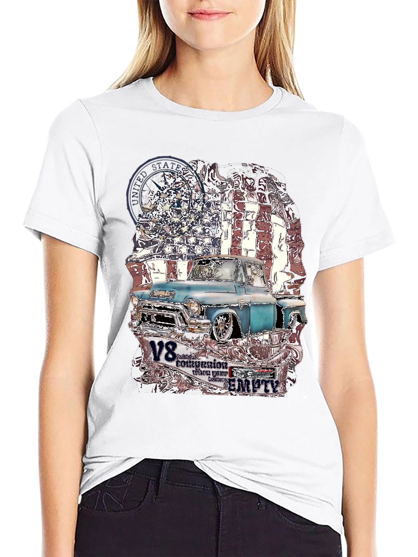 Showcase your love for vintage trucks and American pride with this stylish black t-shirt. The design features a classic blue truck overlaid on a distressed American flag backdrop, incorporating elements of vintage automotive culture. Emblazoned with 'V8', it speaks to the heart of truck enthusiasts. Made from comfortable, breathable fabric, this tee is ideal for casual wear, car shows, or simply expressing your passion for classic vehicles. Perfect for gifting or adding a touch of vintage cool to your own wardrobe.