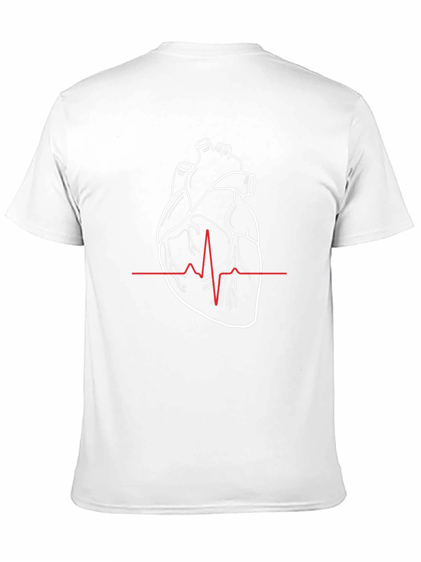This black t-shirt features a striking design of an anatomical heart in white outline, overlaid with a vibrant red heartbeat line. The graphic print stands out prominently against the dark background, creating a bold and eye-catching visual. Made from what appears to be a soft and comfortable cotton blend, this short-sleeved tee offers a classic fit. Perfect for medical professionals, students, or anyone with an interest in anatomy or science. This unique t-shirt is sure to spark conversation and showcase your individual style. Wear it casually with jeans, shorts, or dress it up under a jacket. It's a versatile addition to any wardrobe.