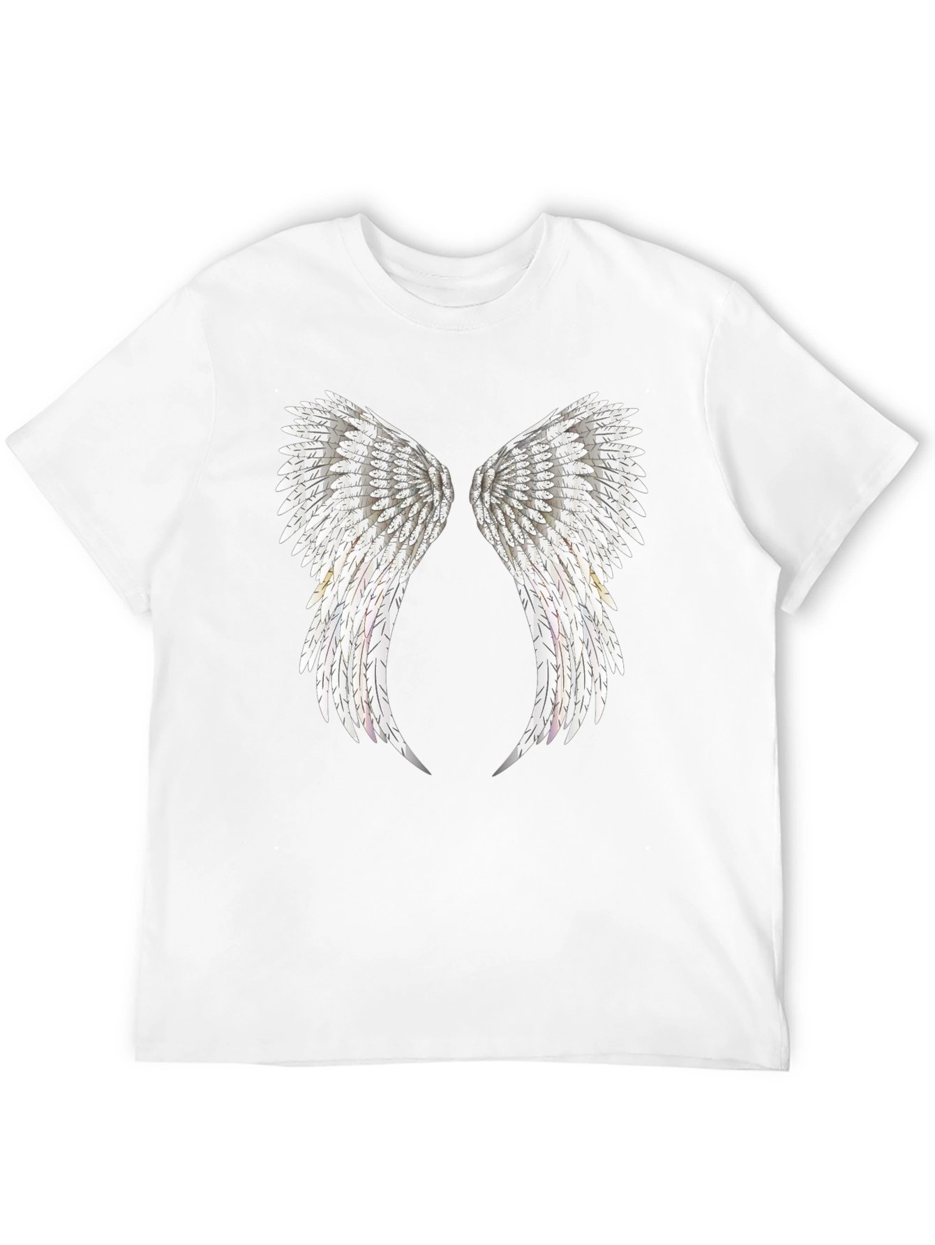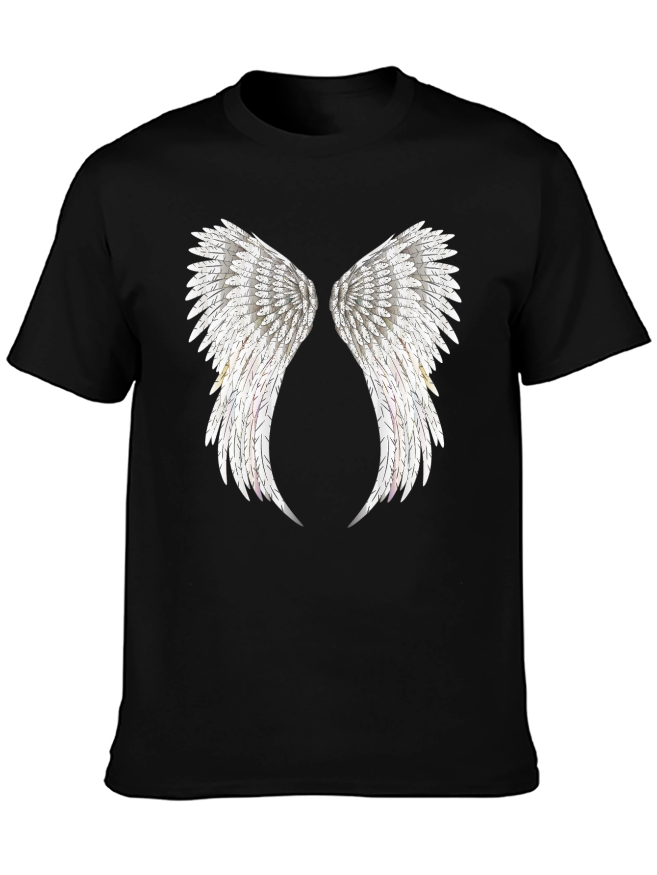 Embrace celestial style with this eye-catching black T-shirt featuring a detailed angel wings print on the front. The wings are intricately designed with individual feathers, creating a realistic and ethereal look. Made from a comfortable and breathable fabric, this tee is perfect for everyday wear or making a statement at casual events. Pair it with jeans or shorts for a relaxed yet fashionable outfit. Show off your unique style and add a touch of angelic grace to your wardrobe with this standout T-shirt.
