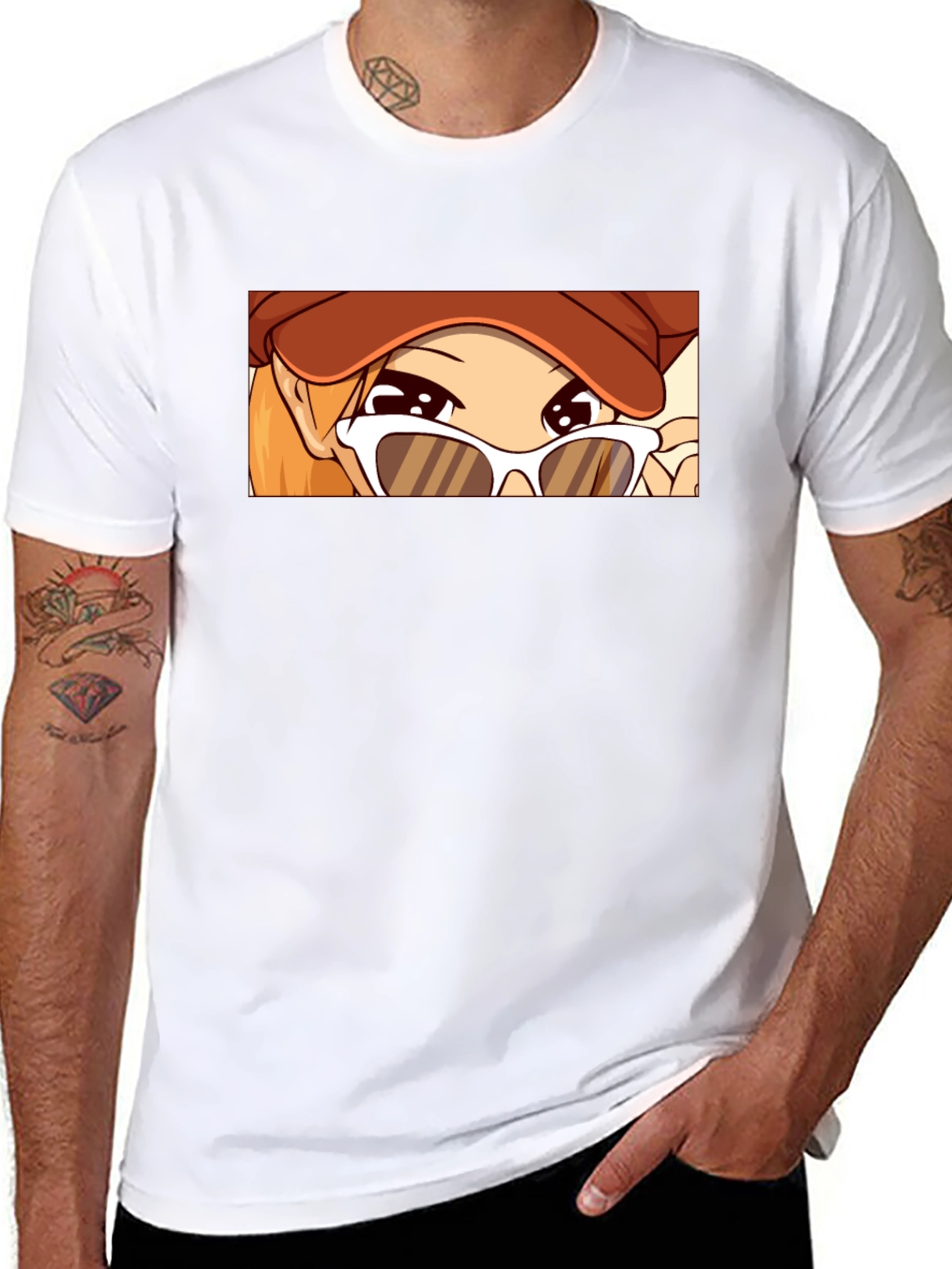 Show off your unique style with this eye-catching black t-shirt. Featuring a vibrant anime girl graphic on the chest, this tee is perfect for casual wear. The design showcases a playful cartoon character with stylish sunglasses and a trendy cap, adding a touch of fun to your outfit. Made from comfortable, breathable fabric, it's ideal for everyday use. Whether you're hanging out with friends or expressing your love for anime, this t-shirt is sure to turn heads. A must-have for any fan, this tee combines comfort and cool design in one stylish package.