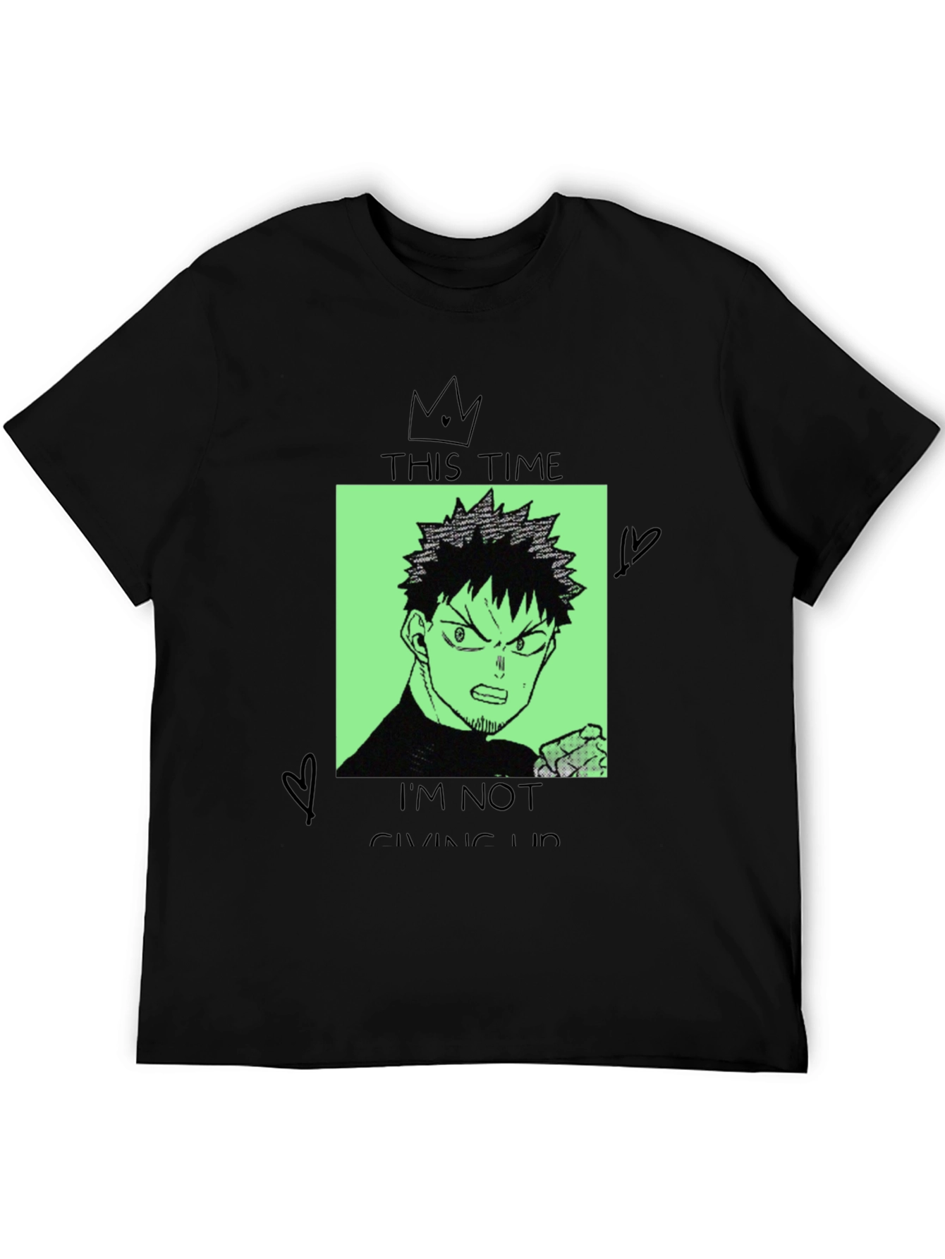 Show off your determined spirit with this unique black graphic tee. The shirt features a striking anime-style graphic of a determined character, set against a bold green background. Above and below the character are the words "THIS TIME I'M NOT GIVING UP", conveying a message of resilience. The design incorporates artistic touches like a crown and heart shapes, adding a touch of whimsy. Crafted from comfortable, breathable fabric, this t-shirt is ideal for everyday wear. Pair it with jeans for a casual look, or dress it up with a blazer. Whether you're heading to a convention, hanging out with friends, or just expressing your individuality, this tee is sure to turn heads and spark conversations.