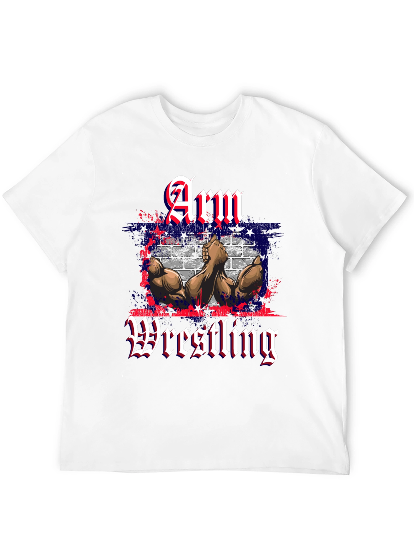 Show off your love for arm wrestling with this eye-catching black t-shirt. The design features bold "Arm Wrestling" text in a gothic font, overlaid on a stylized image of muscular arms in a wrestling pose, set against a backdrop of what appears to be an American flag-inspired brick wall design with red, white, and blue accents. This t-shirt is perfect for casual wear, gym sessions, or showing your passion for the sport. Made from comfortable materials, this shirt is a must-have for any arm wrestling enthusiast.