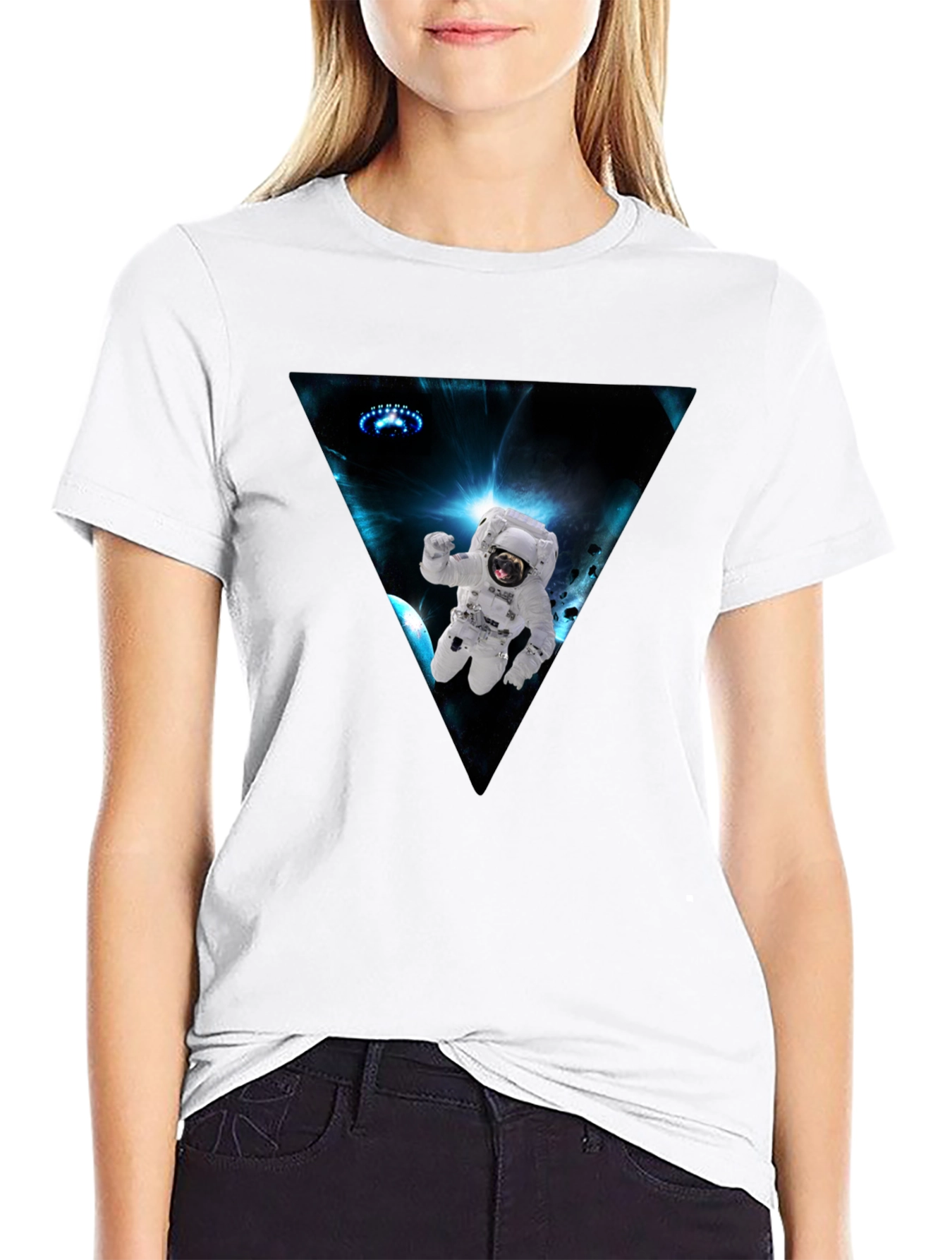 Explore the cosmos with this unique graphic tee! The shirt features a striking triangular design with an astronaut floating in a vibrant, space-themed backdrop. A mysterious UFO adds an element of intrigue to the captivating design. Crafted from a soft, comfortable fabric, this tee is perfect for everyday wear. The classic black color makes it versatile for pairing with jeans, shorts, or joggers. Show off your love for space exploration with this stylish and eye-catching t-shirt. A must-have for anyone with a passion for the universe!