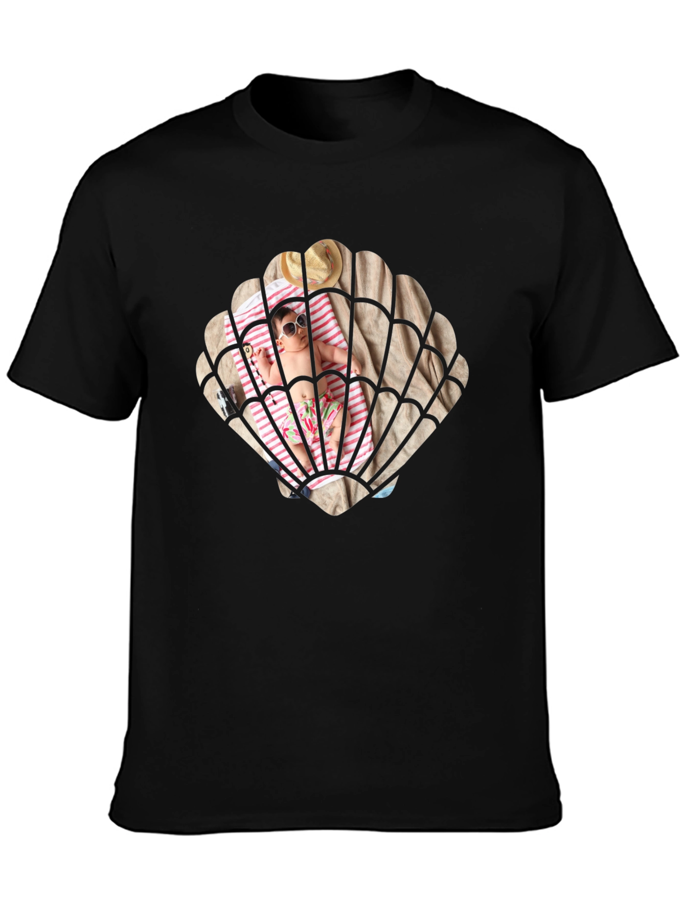Show off your fun side with this unique t-shirt! This black tee features a playful graphic of a baby enjoying a beach day inside a seashell. The design captures the essence of summer with a sandy beach, striped towel, sunglasses, and a sun hat. Made from a comfortable fabric, this t-shirt is perfect for casual wear, beach outings, or as a fun gift for new parents. Get yours today and let the good times roll!