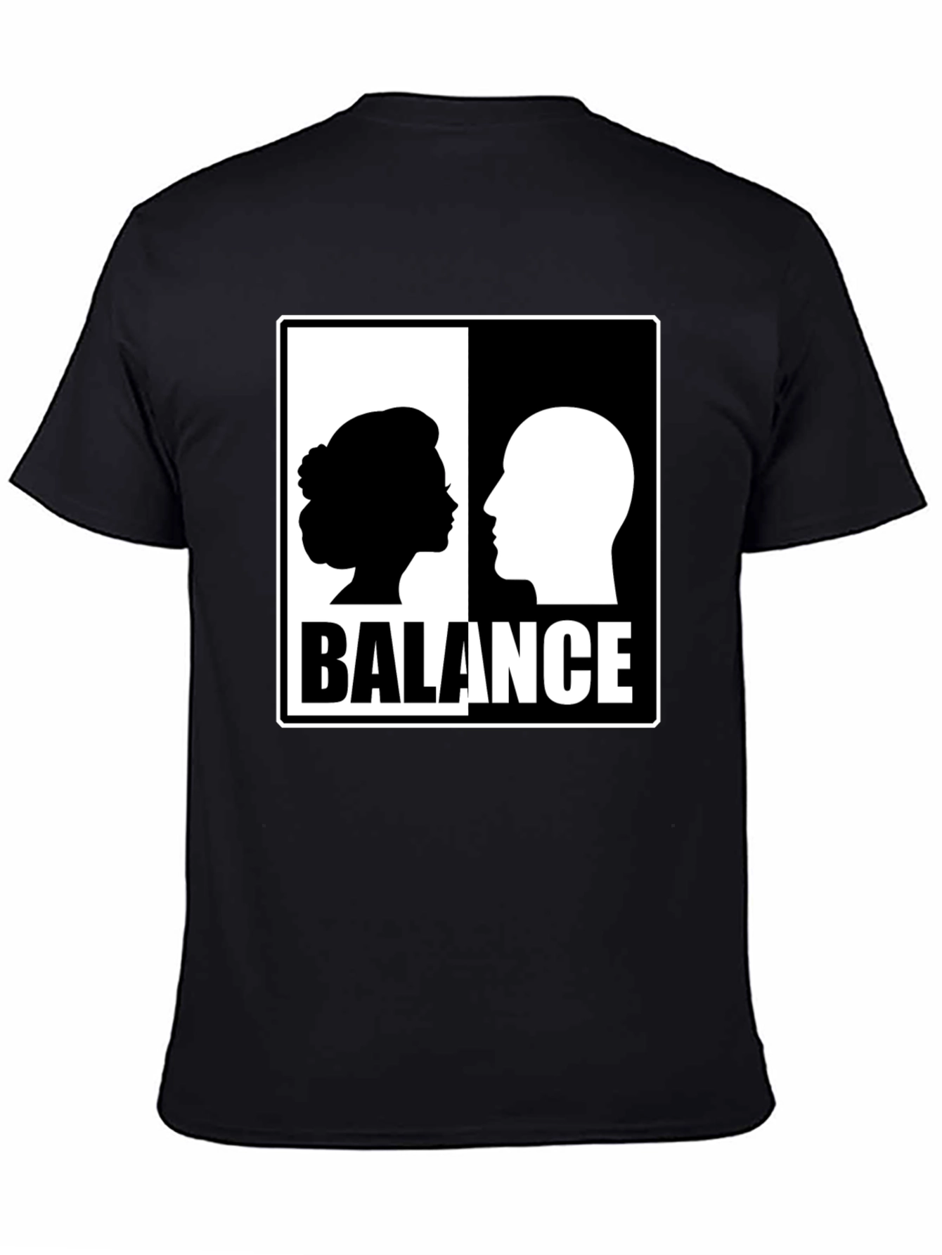Showcase your unique style with this eye-catching black graphic t-shirt. Featuring a bold, contrasting "BALANCE" design, this tee is sure to turn heads. The graphic is set in a square on the front of the shirt with a woman on the left and a man on the right. Made from soft, breathable fabric, it offers all-day comfort and is perfect for casual wear. Pair it with jeans or shorts for a relaxed yet fashionable look. Great for expressing individuality and sparking conversations. A must-have addition to any modern wardrobe. Add this expressive graphic tee to your collection today!