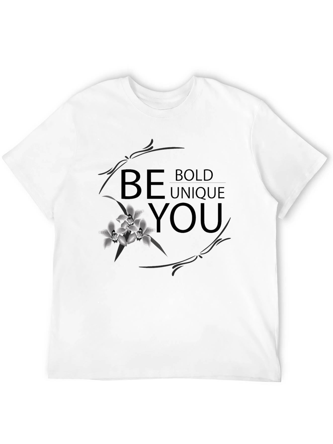 This stylish black tee features a striking graphic design with the words "Be Bold Unique You" artfully displayed with floral accents. The design is eye-catching and elegant, perfect for adding a touch of personality to your casual wardrobe. The tee has a comfortable fit and classic short sleeves. Crafted from soft, breathable fabric, it's ideal for everyday wear. Show off your unique style with this statement piece that combines comfort and fashion.