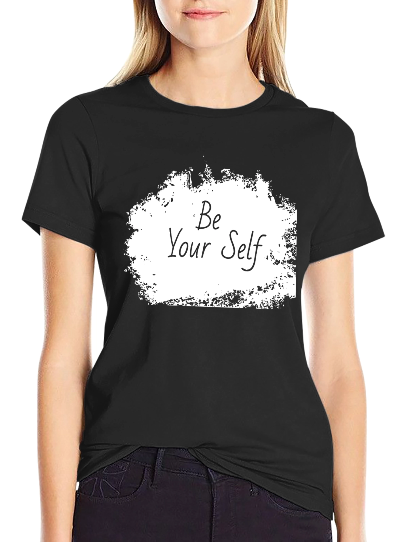 Show off your unique style with this bold black T-shirt. Featuring a statement "Be Yourself" graphic, this tee is perfect for casual wear. The crisp white print pops against the sleek black background. Crafted from a comfortable, breathable fabric, this shirt is ideal for everyday wear, whether you're running errands or hanging out with friends. Its relaxed fit ensures all-day comfort, while the eye-catching design makes a statement. Express yourself with this must-have addition to your wardrobe.