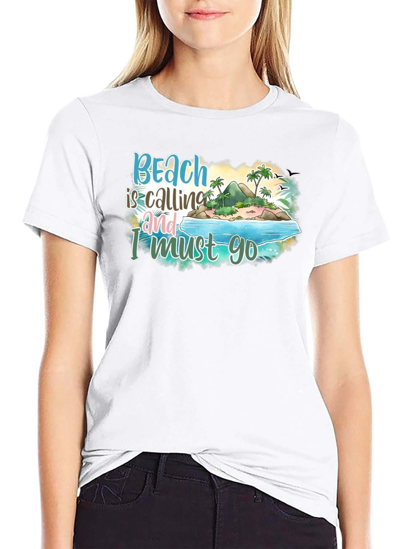 Embrace the call of the ocean with this stylish graphic tee. Crafted from a soft, comfortable fabric, this black t-shirt features a vibrant and eye-catching design. The print showcases a serene beach scene with palm trees, an island, and the playful words "Beach is calling and I must go." This tee is perfect for casual outings, beach vacations, or simply expressing your love for the coastal lifestyle. Pair it with shorts or jeans for a relaxed and effortless look. Let this t-shirt transport you to paradise wherever you go!