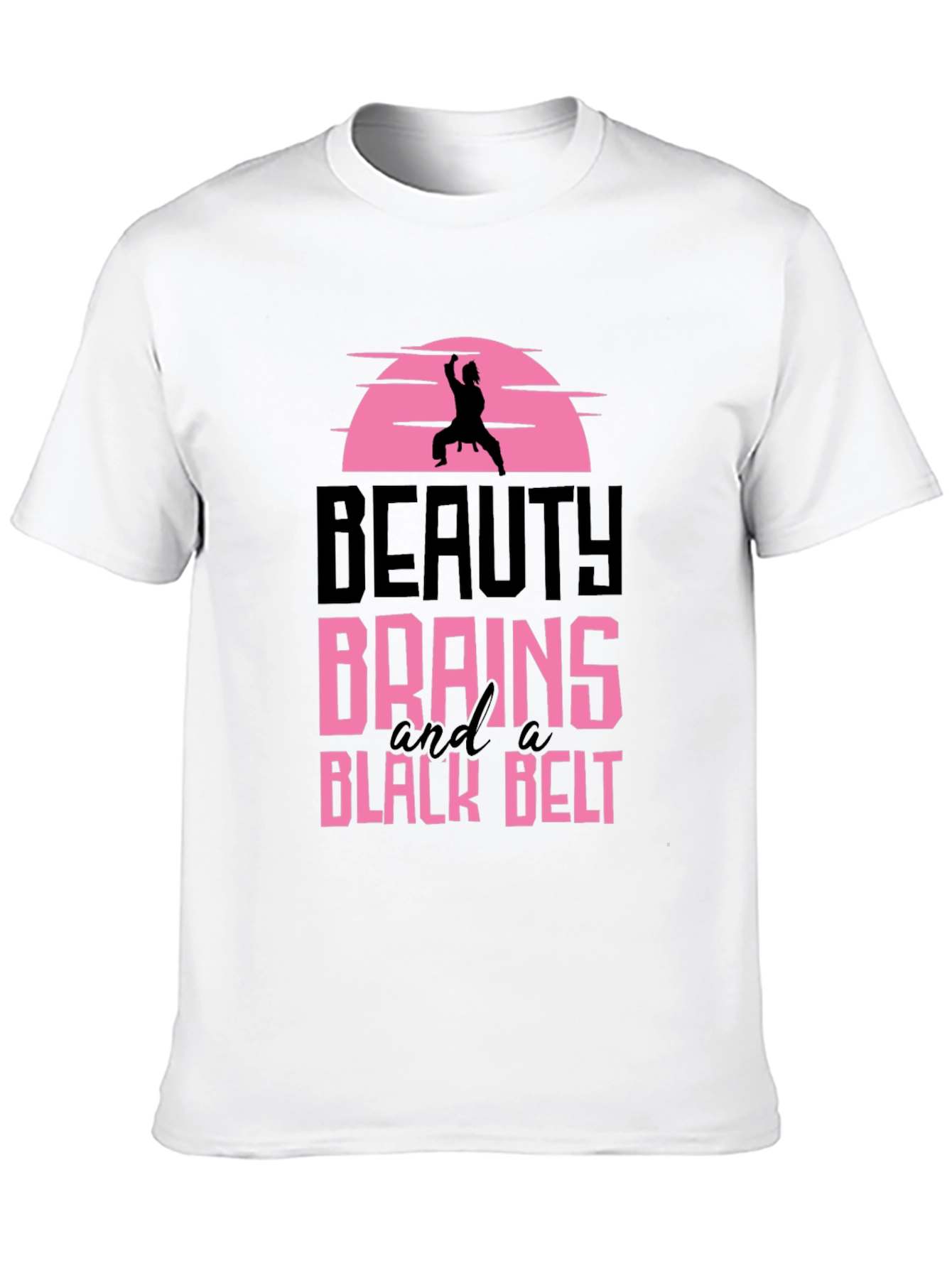 Show off your strength and smarts with this unique graphic tee! Featuring a bold design with a karate silhouette set against a pink sunset, the text 'Beauty Brains and a Black Belt' is displayed in eye-catching pink and black lettering. The shirt appears to be made of a soft, comfortable black material, ideal for everyday wear or training sessions. Perfect for the powerful woman who embraces both intelligence and martial arts. Express your multifaceted personality with this statement piece!