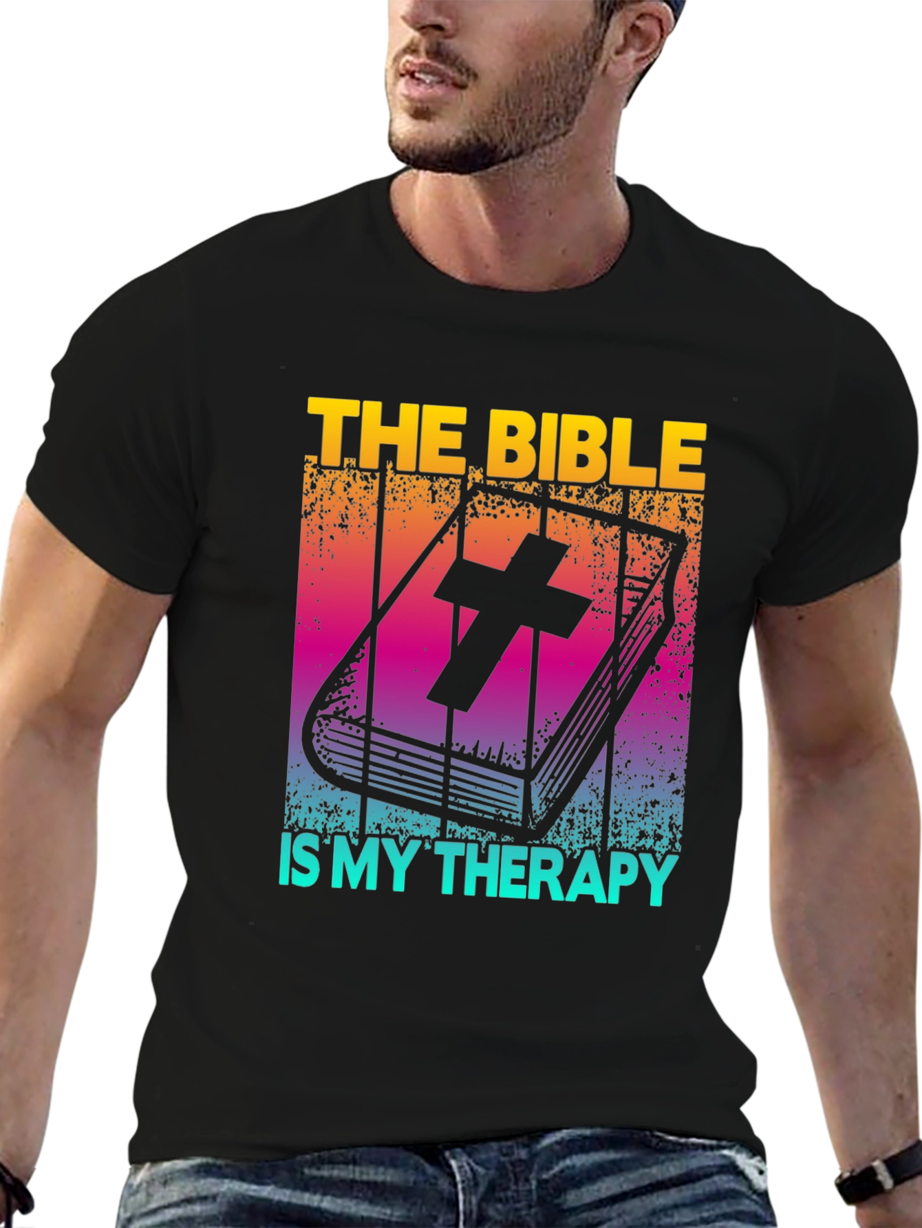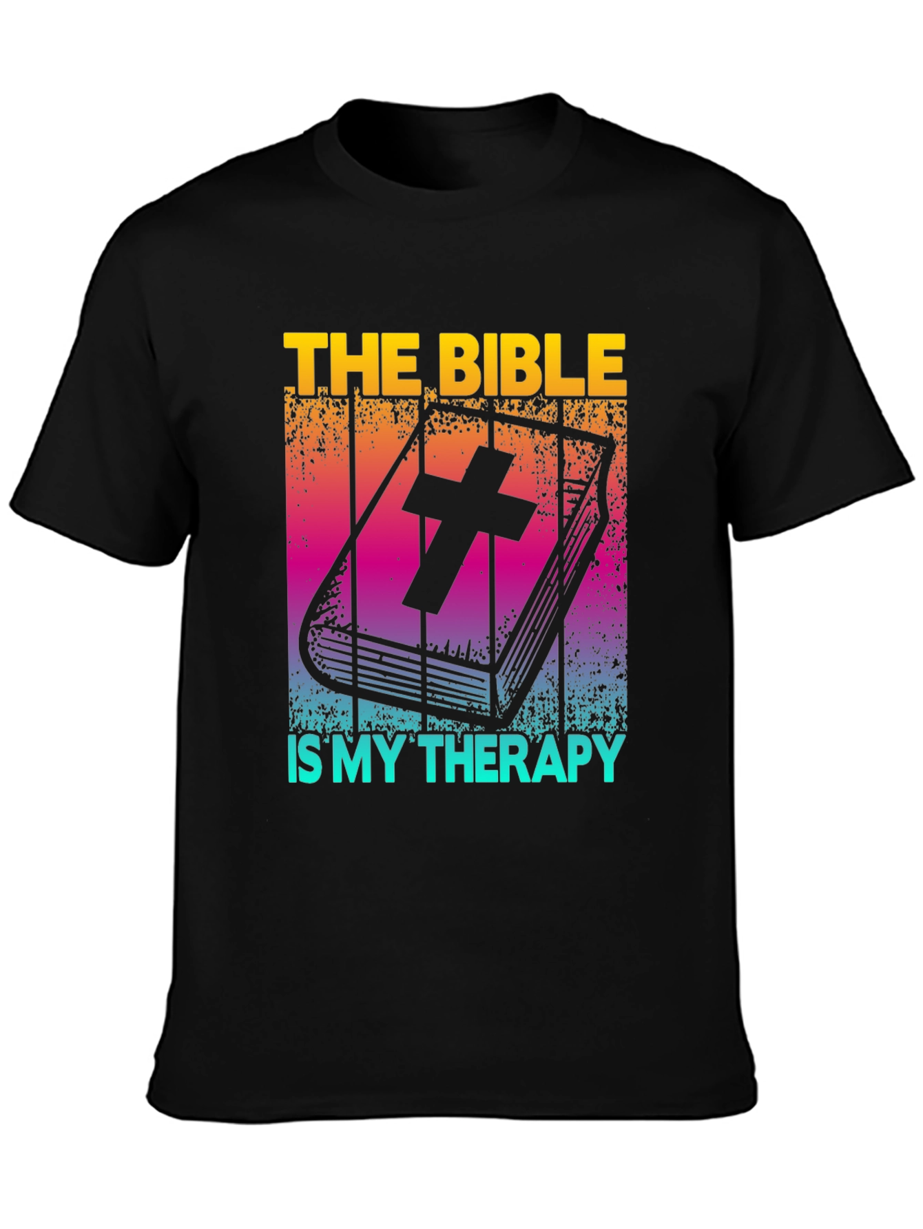 Find solace and strength in faith with this unique "The Bible is My Therapy" T-shirt. Crafted from comfortable, breathable fabric, this black tee features a vibrant, retro-style graphic of an open Bible adorned with a cross. The colorful gradient background adds a touch of visual appeal, making it a stylish way to express your beliefs. Perfect for everyday wear, church gatherings, or as a thoughtful gift for someone who finds peace in scripture. Embrace your faith with comfort and style!