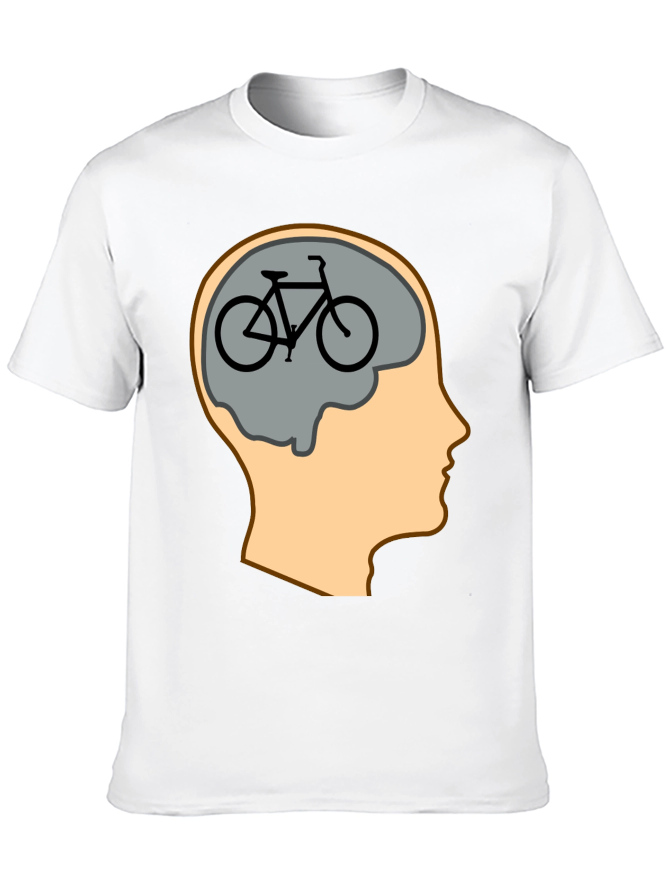 This stylish black t-shirt features a unique and eye-catching graphic design. It shows a profile of a head, and within the head is a bike. This suggests the wearer is passionate about cycling, which makes it great for casual wear, bike rides, or cycling events. The shirt appears to be made from a soft and comfortable material, making it perfect for everyday use. Show off your love for cycling with this conversation-starting t-shirt. It will look great with jeans, shorts, or even dressed up with a blazer. A must-have addition to any cyclist's wardrobe!