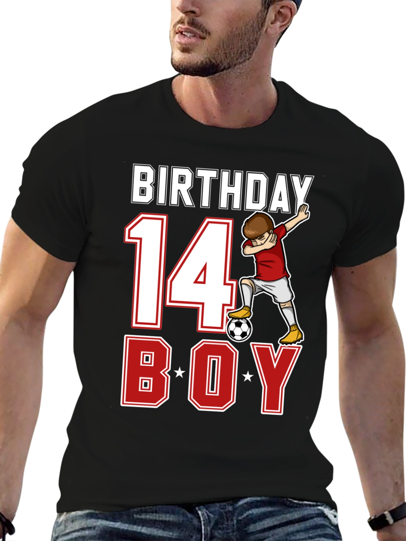 Celebrate a 14th birthday with this fun soccer-themed t-shirt! The black tee features a bold "BIRTHDAY" print above the number "14" and the word "BOY", all outlined in striking red and white. A cartoon boy in a soccer uniform is shown doing a 'dab' pose with a soccer ball at his feet, adding a playful touch. This short sleeve shirt is perfect for a birthday party, soccer practice, or casual wear. The vibrant graphic makes it a standout piece, ideal for any young soccer enthusiast celebrating their special day.