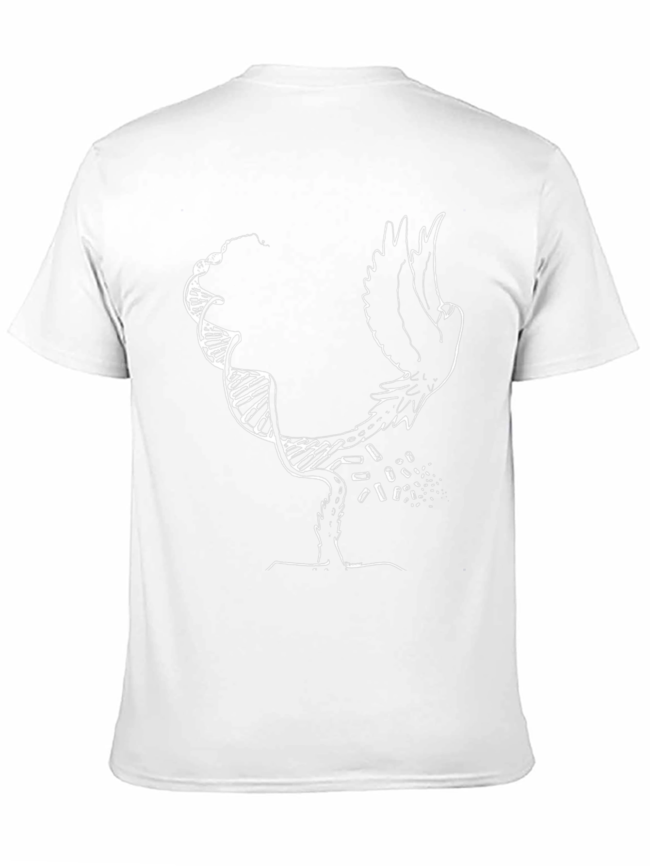 Show off your unique style with this black graphic tee. This t-shirt features a distinctive white graphic design: A double helix that transforms into a bird in flight. The design blends science and nature in a striking visual. The black backdrop makes the design pop, perfect for casual wear or layering under a jacket. Made with comfortable, breathable materials, this shirt is ideal for everyday wear. Add this artistic tee to your wardrobe for a cool and modern look.