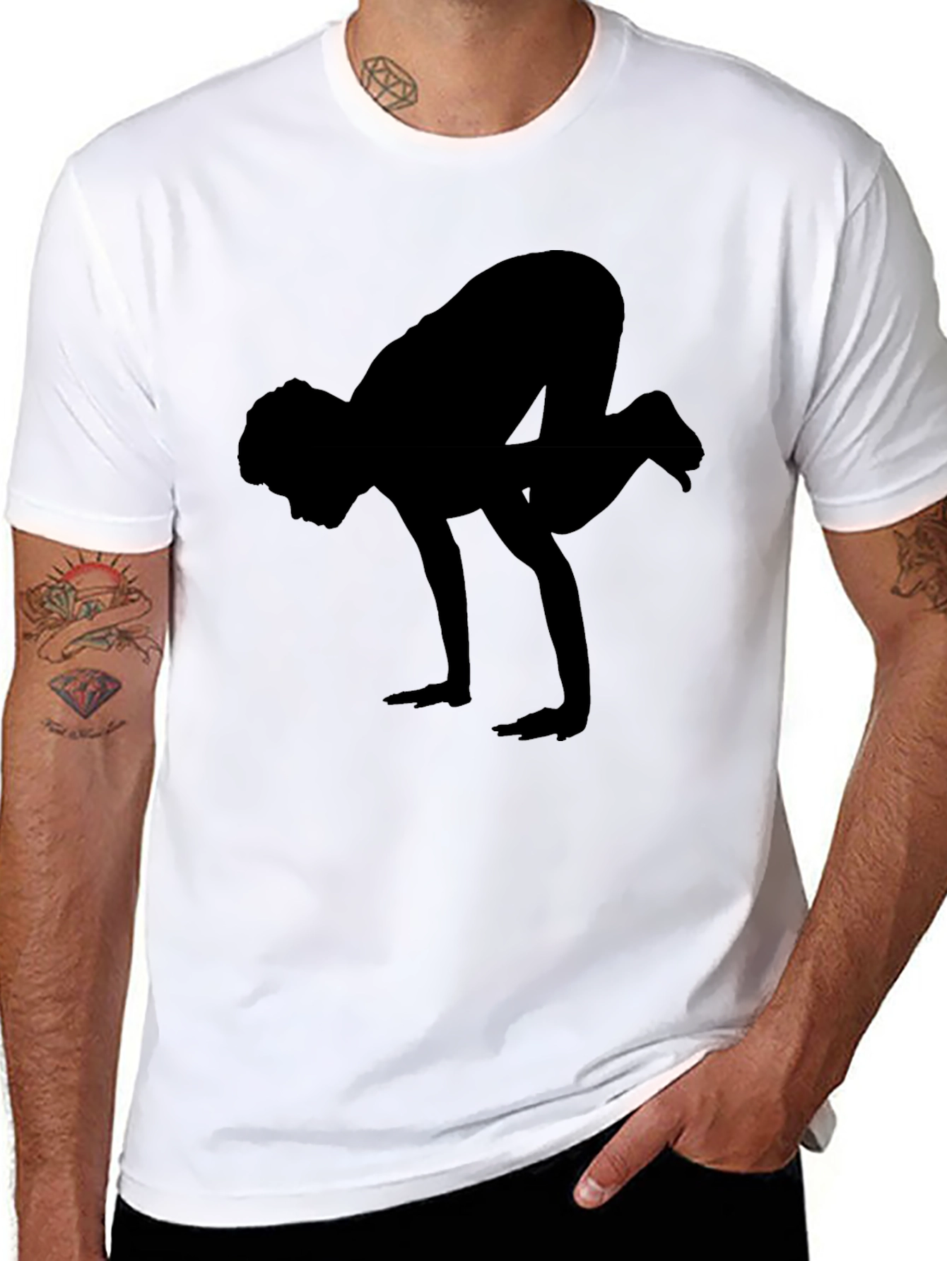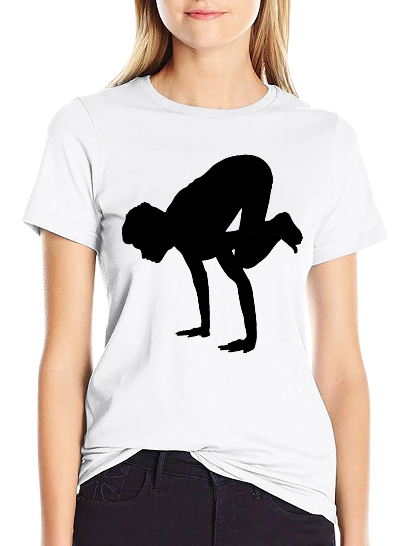Showcase your love for yoga with this stylish black t-shirt. The shirt features a striking silhouette of a person in a yoga pose. Made from a soft, comfortable fabric, this tee is perfect for casual wear, workouts, or yoga sessions. The simple yet eye-catching design makes it a versatile addition to any wardrobe. Whether you're a yoga enthusiast or simply appreciate minimalist graphic tees, this shirt offers a blend of comfort and style. Pair it with your favorite jeans or leggings for a relaxed and fashionable look.