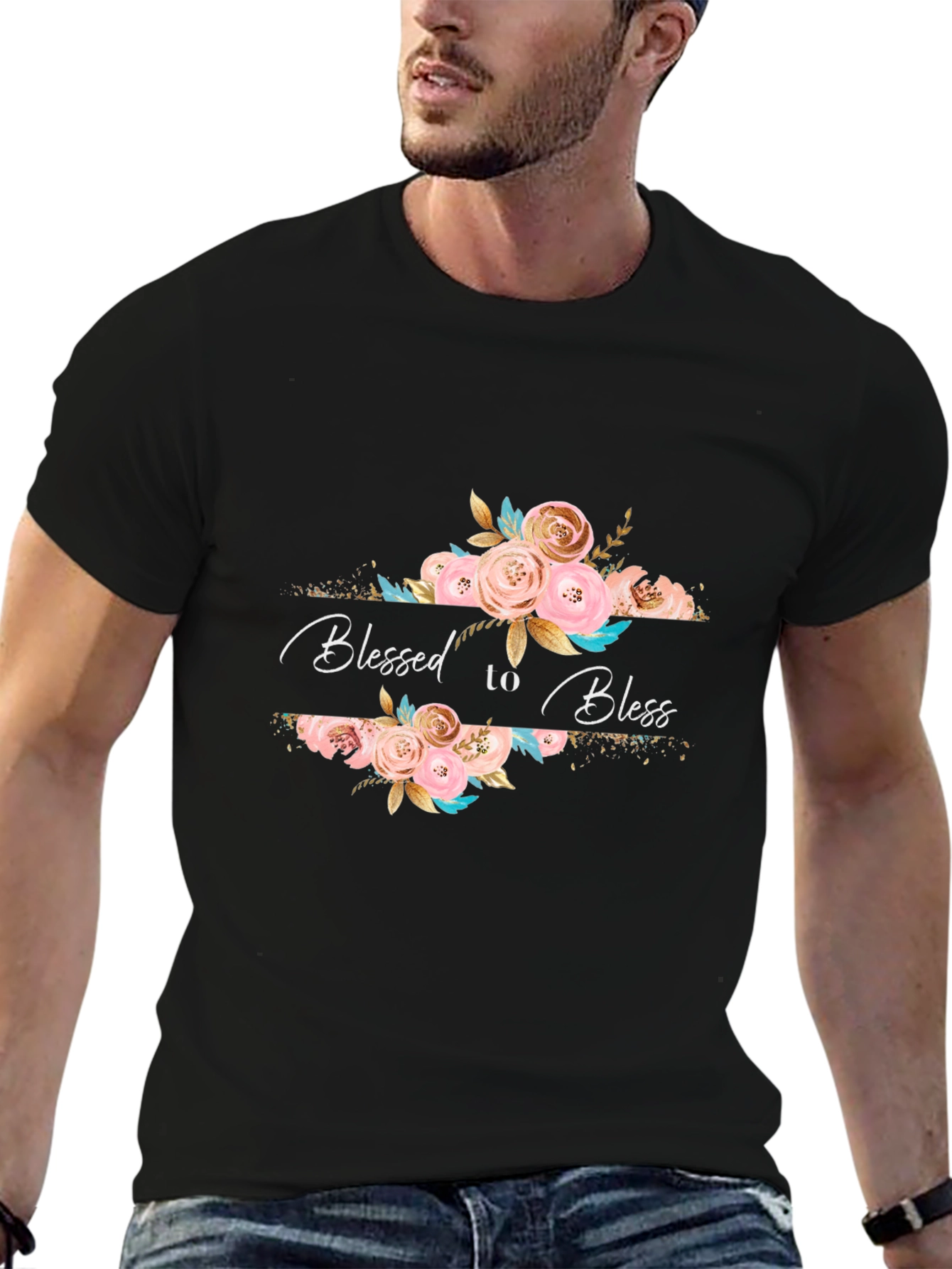 This classic black t-shirt features an elegant design with the phrase "Blessed to Bless" nestled within beautiful floral accents. The soft pink flowers and delicate gold leaves create a stylish and sophisticated look. Made from comfortable fabric, this t-shirt is perfect for everyday wear or special occasions. Showcase your faith and style with this unique floral t-shirt. It's ideal for casual outings, church events, or as a thoughtful gift. Let this t-shirt be a reminder of your blessings and your calling to bless others.