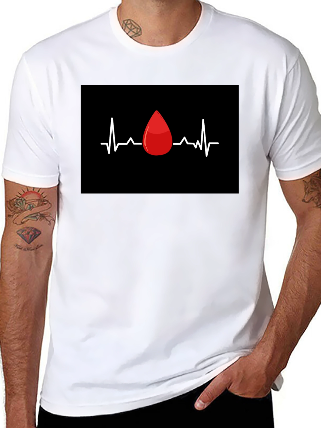 Show your passion with this unique black T-shirt featuring a bold graphic print. The design showcases a vivid red blood drop centered within a white heartbeat line, all set against a striking black background. Made from a comfortable and breathable fabric, this tee is perfect for everyday wear, casual outings, or making a statement about blood donation awareness. Its eye-catching design is sure to turn heads and spark conversations. This stylish and comfortable tee is a must-have addition to any wardrobe.
