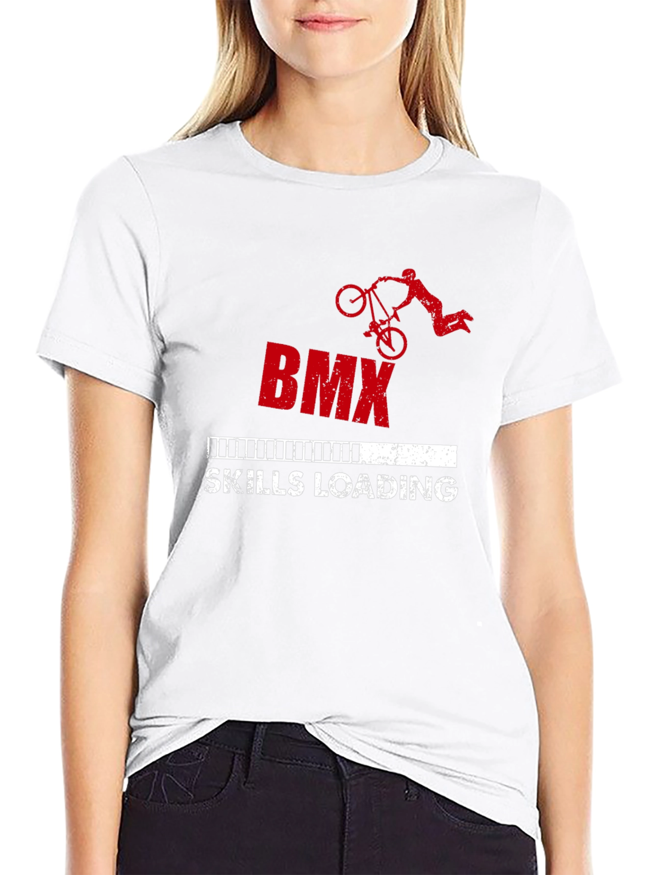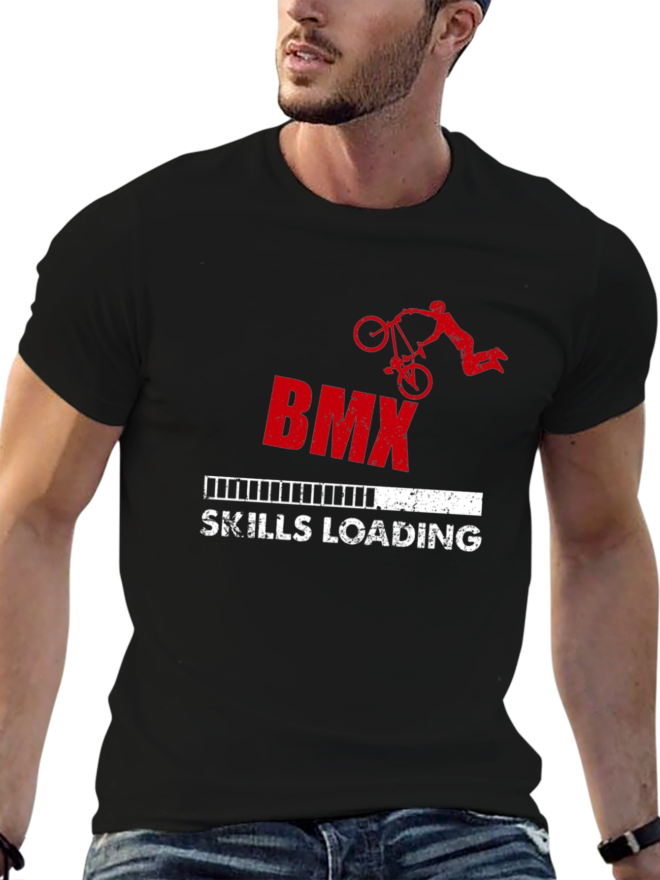 Show off your passion for BMX with this stylish black t-shirt. Featuring a bold graphic design of a BMX rider performing a trick, alongside the words "BMX" and "SKILLS LOADING" with a loading bar. Made from comfortable material, this shirt is perfect for casual wear, hitting the skate park, or hanging out with friends. The eye-catching design is sure to turn heads and spark conversations among fellow BMX enthusiasts. A must-have addition to any BMX lover's wardrobe, this t-shirt combines comfort, style, and a love for the sport.
