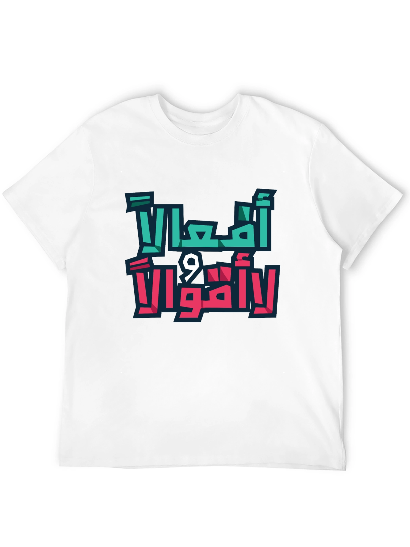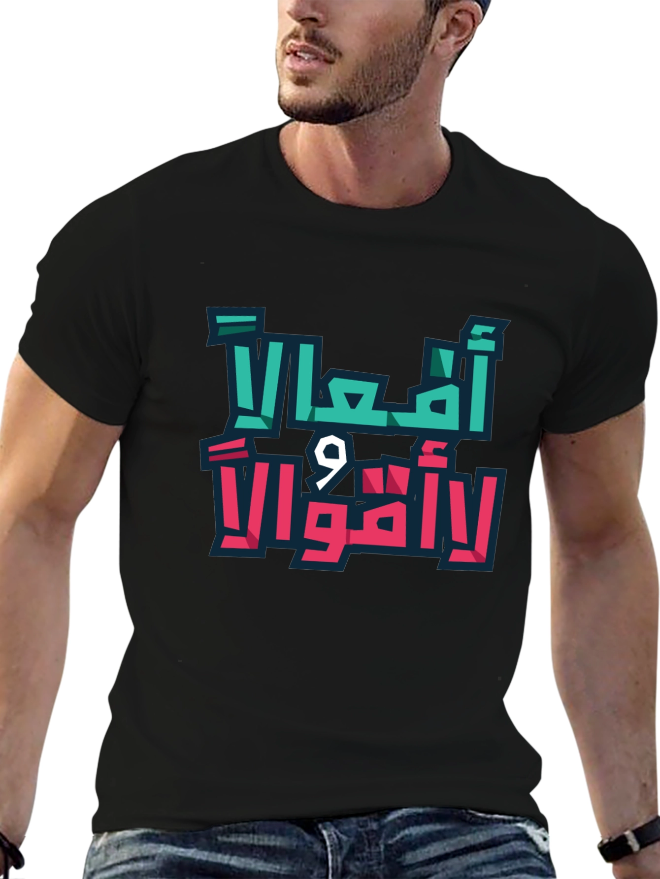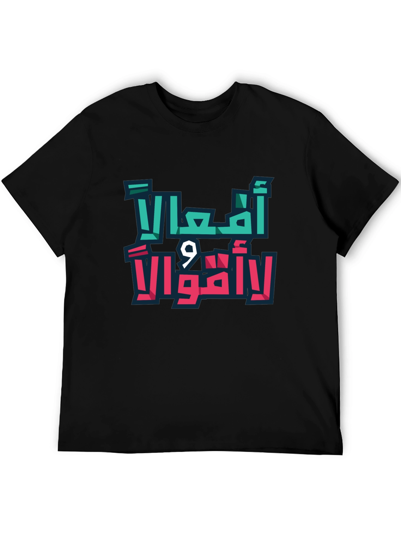 Make a statement with this eye-catching black t-shirt featuring a bold Arabic graphic design. The print, in vibrant teal and pink, showcases the powerful message "Actions, Not Words". Crafted from a comfortable, breathable fabric, this tee is perfect for everyday wear. The striking design is sure to turn heads and spark conversations. Whether you're making a statement, expressing yourself, or simply looking for a stylish and unique piece, this t-shirt is an excellent choice. Pair it with jeans or shorts for a casual yet impactful look.