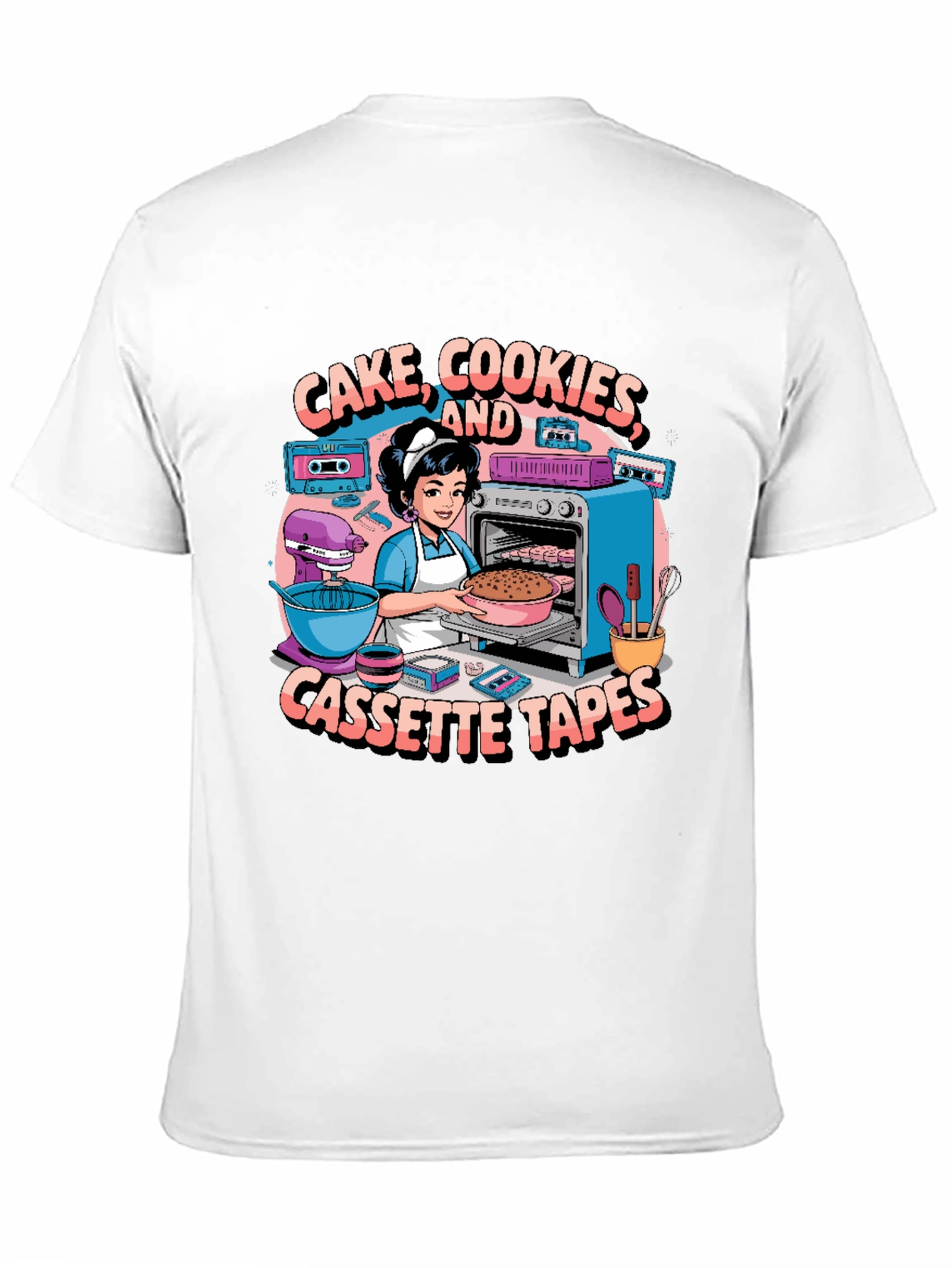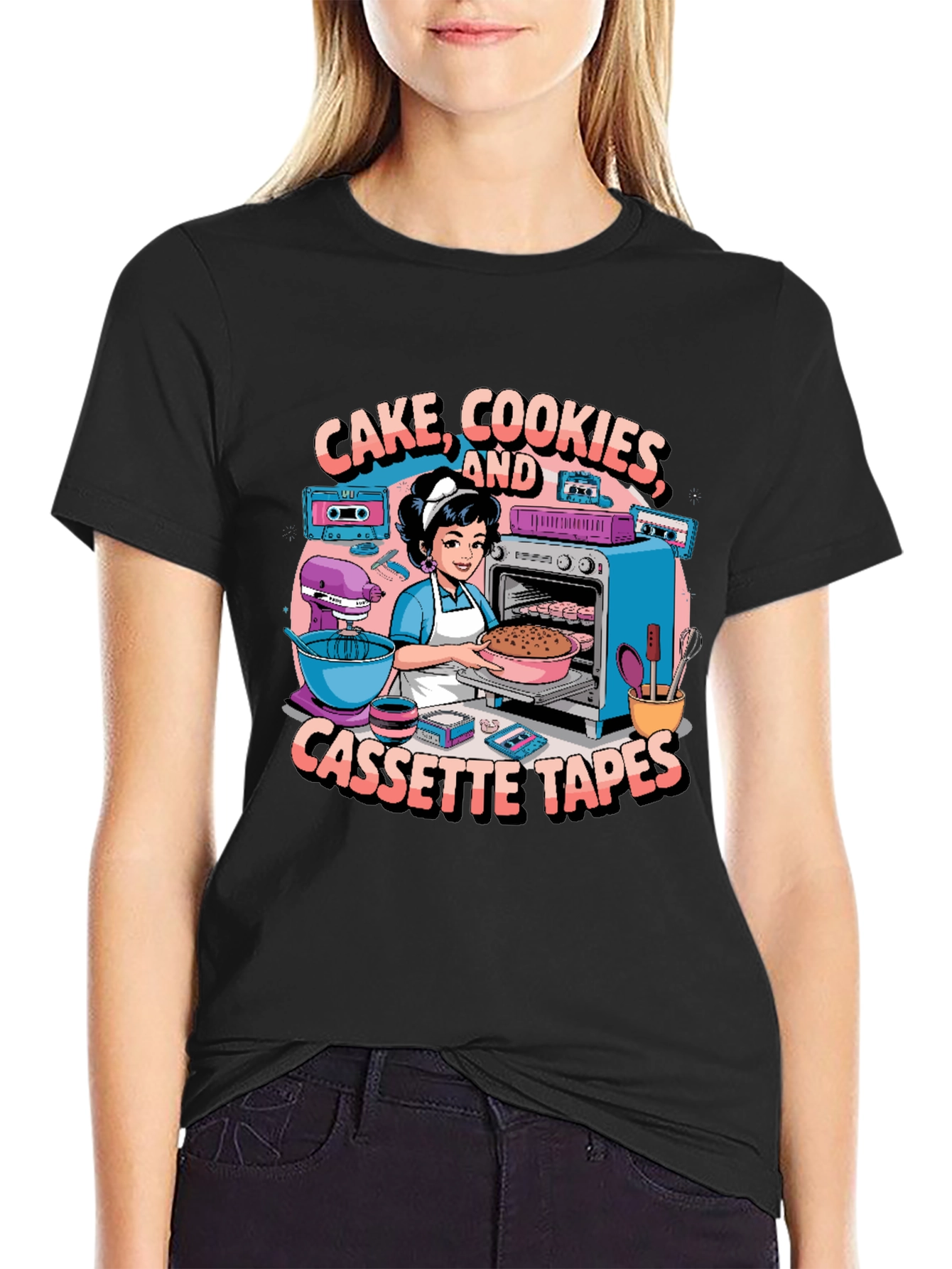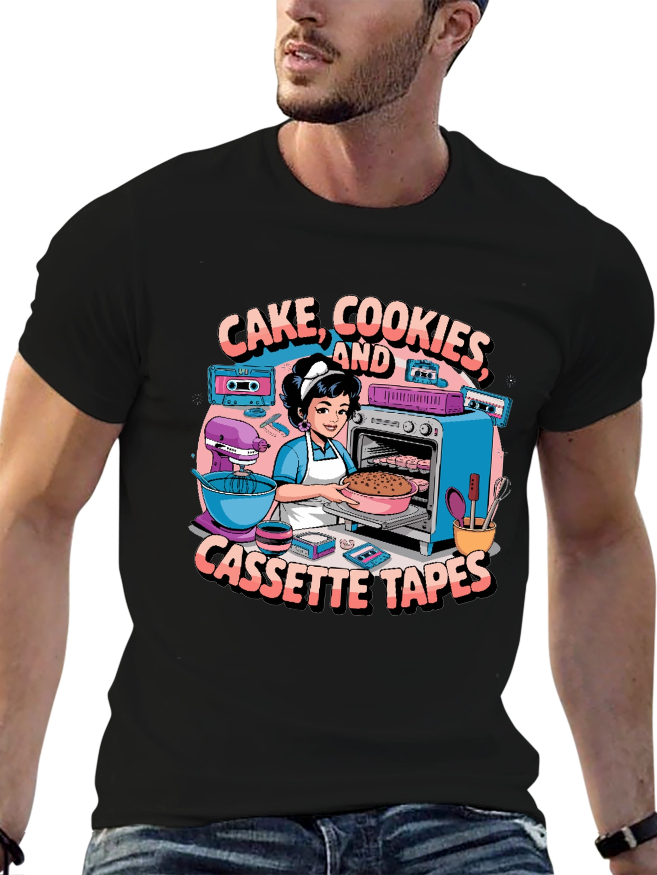 Show off your love for baking and retro vibes with this unique graphic tee! The design features a charming cartoon depicting a baker surrounded by classic cassette tapes, a mixer, and oven, all while surrounded by the fun slogan "Cake, Cookies, and Cassette Tapes". Perfect for home bakers, music lovers, or anyone with a taste for nostalgia. This black t-shirt is made from comfortable fabric, ideal for everyday wear, whether you're in the kitchen, out with friends, or just relaxing at home. Add some personality to your wardrobe with this fun and quirky design!