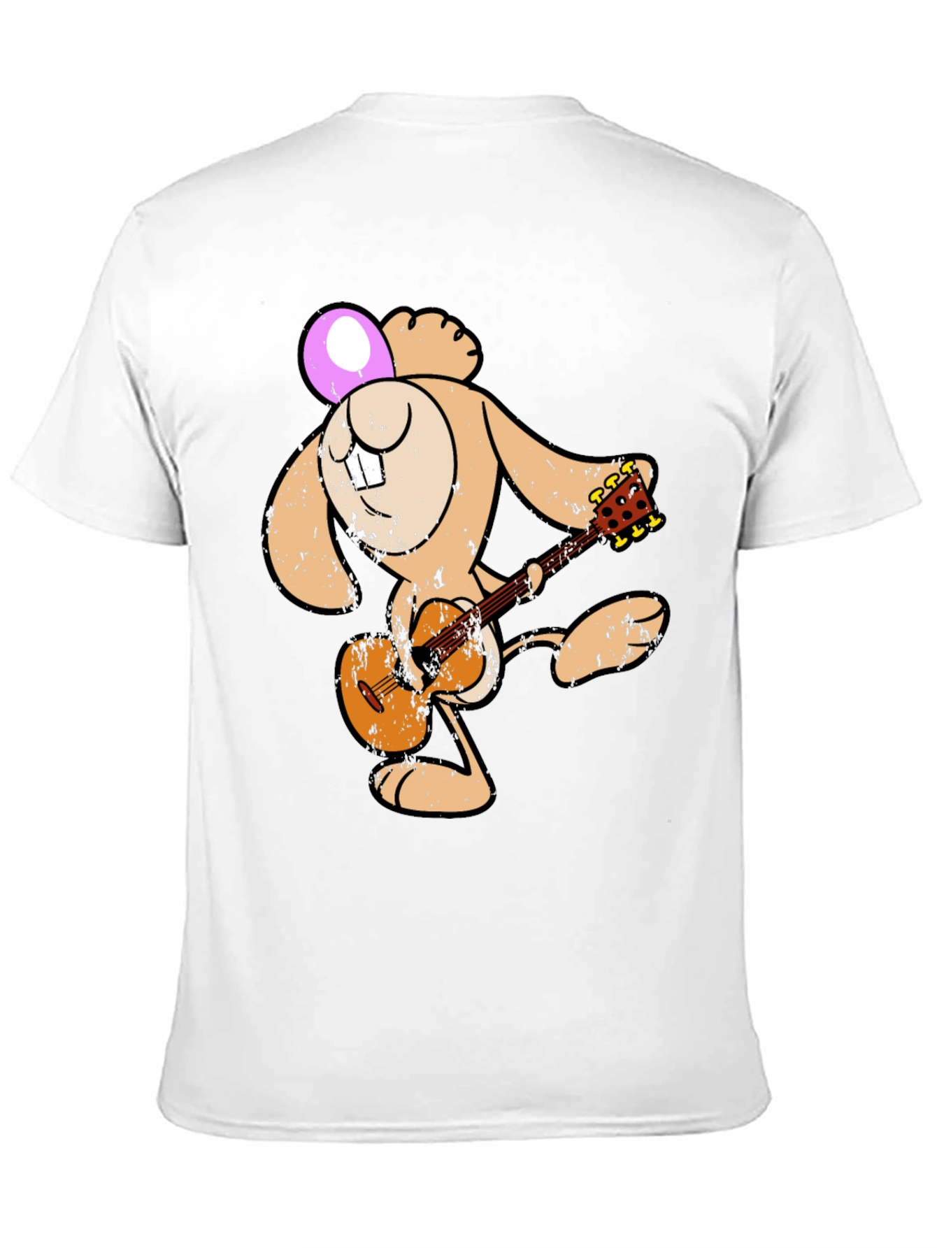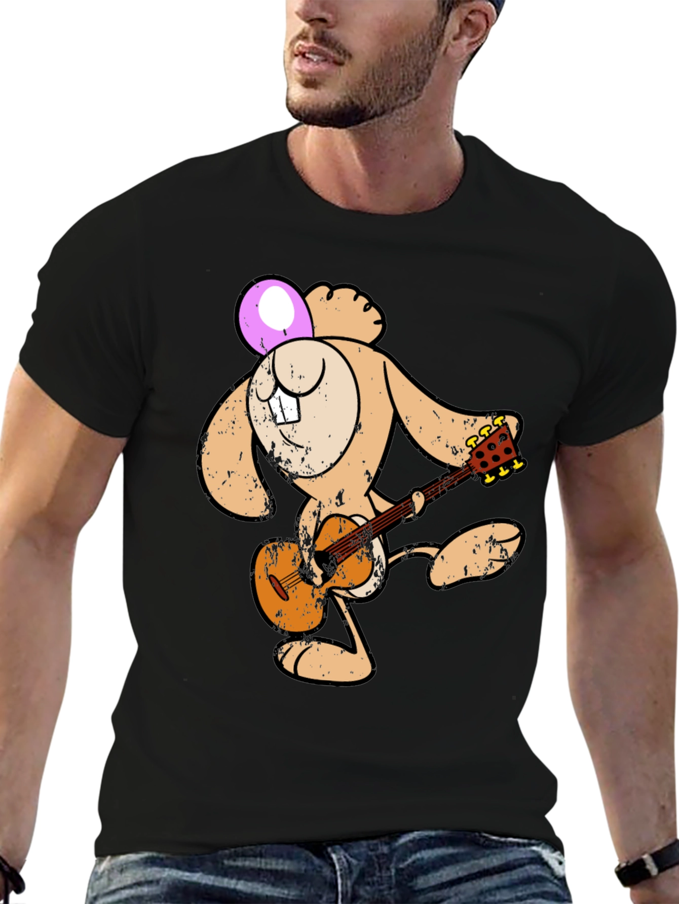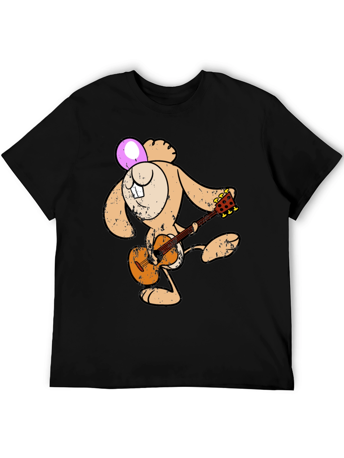 Show off your fun side with this unique graphic tee! This black t-shirt features a cool cartoon design of a tan bunny playing a brown acoustic guitar. The bunny's head is adorned with a pink Easter egg and its quirky snaggletooth. The vintage distressed design gives this tee a cool, worn-in look, perfect for casual wear. Made from soft, breathable fabric, this shirt is comfortable enough for everyday activities, concerts, or just hanging out with friends. Grab this unique tee and express your love of music and quirky cartoon style!