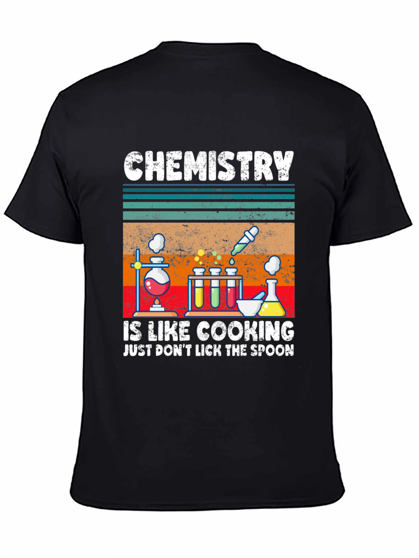 This fun, novelty black t-shirt features a colorful graphic perfect for science enthusiasts and chemistry lovers. The design showcases vintage stripes, along with science-themed images of beakers and test tubes. The text "CHEMISTRY IS LIKE COOKING, JUST DON'T LICK THE SPOON" adds a humorous touch. Made from comfortable and durable fabric, this shirt is ideal for casual wear, science events, or as a conversation starter. It's a great gift for teachers, students, or anyone passionate about chemistry.