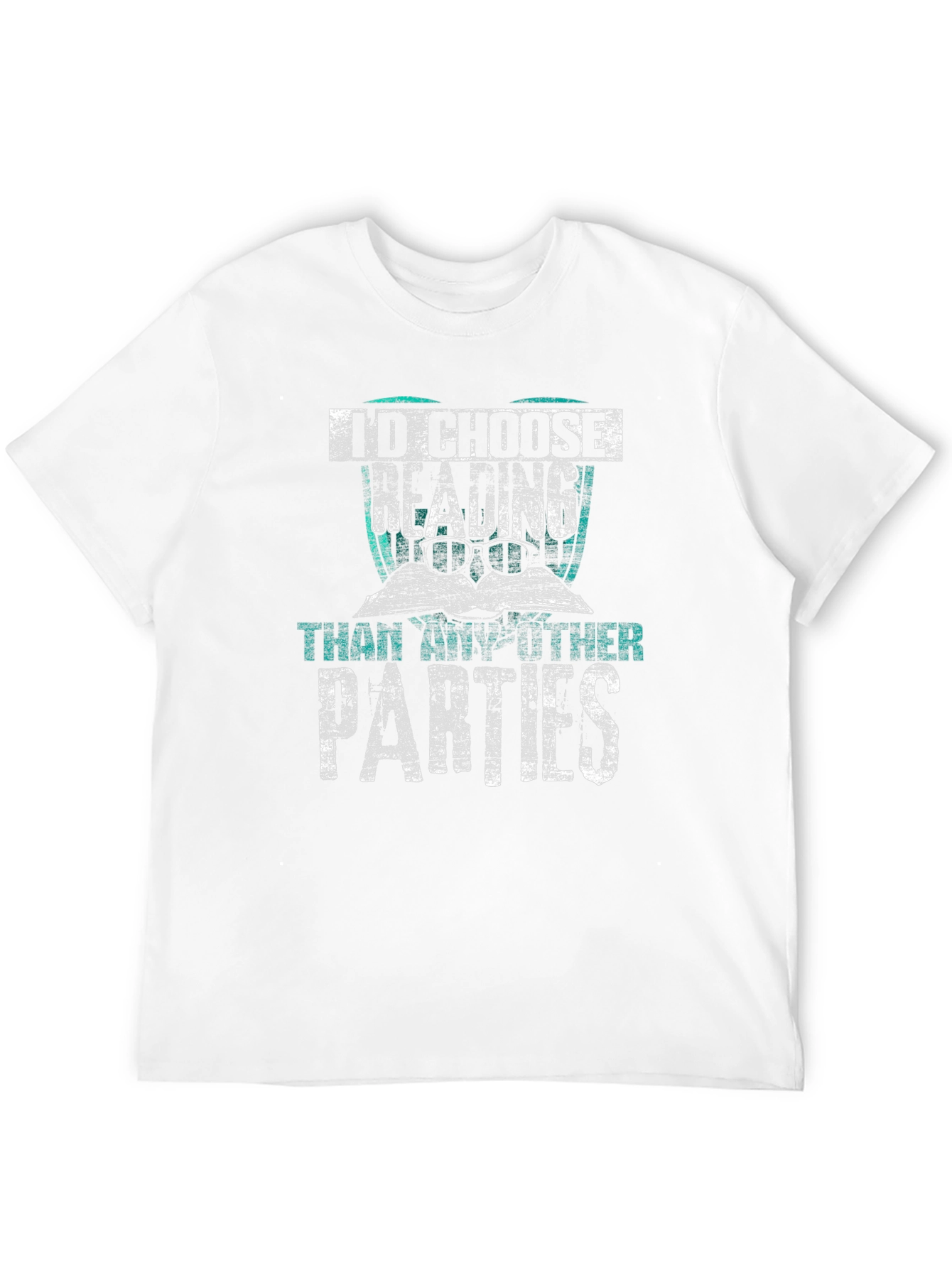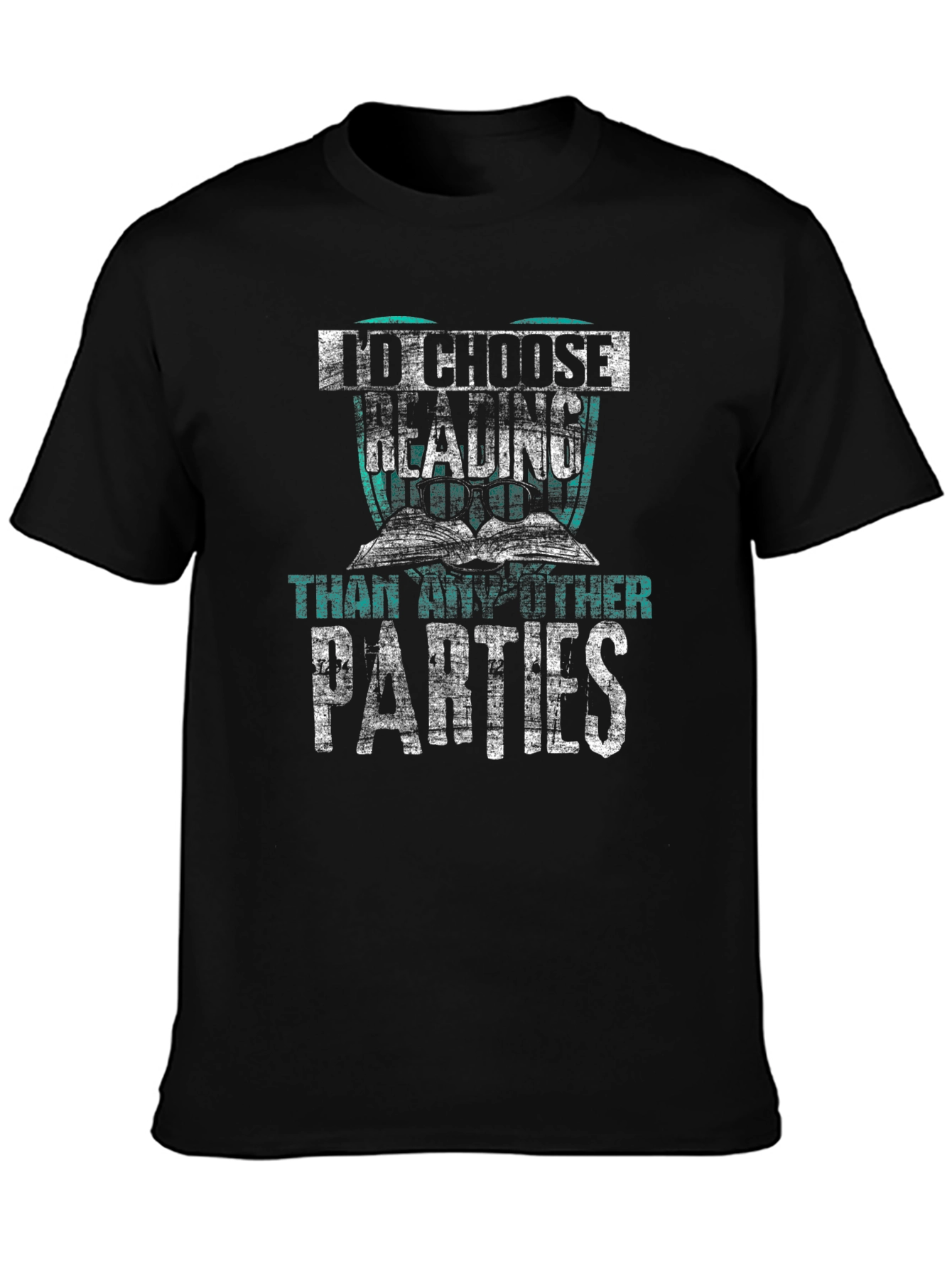 Show off your love for literature with this stylish black T-shirt. The tee features a unique graphic design with the phrase "I'd Choose Reading Than Going to Other Parties", perfect for bookworms and introverts. The design incorporates images of an open book, making it a great conversation starter. Made from a comfortable, breathable fabric, this T-shirt is ideal for casual wear, library visits, or book club meetings. Express your passion for reading with this statement piece!