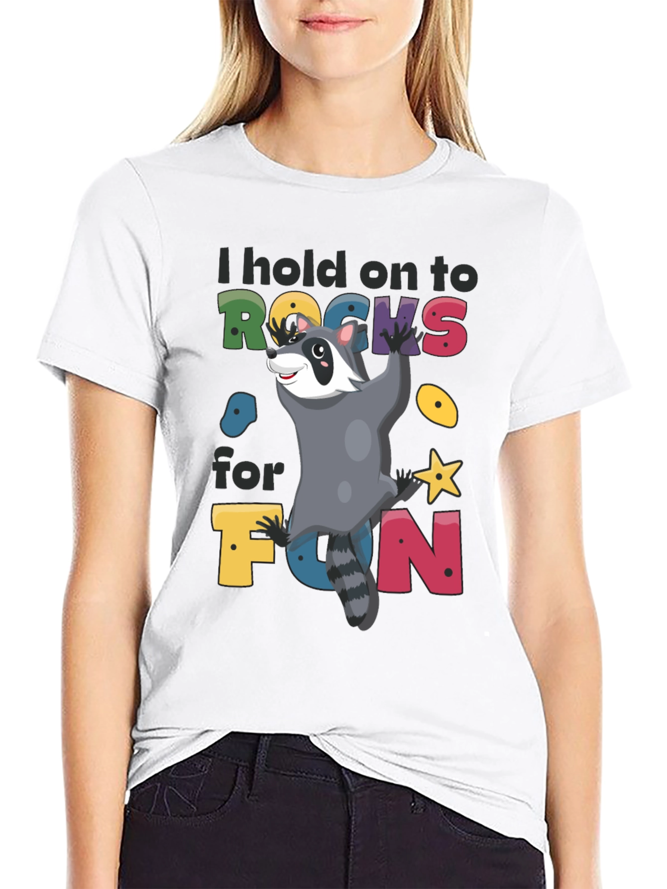 Show off your love for climbing and adorable animals with this unique t-shirt. Featuring a playful cartoon raccoon clinging to colorful climbing holds, this shirt is sure to turn heads. The fun design is paired with the phrase "I hold on to Rocks for FUN". Made from a soft, comfortable fabric, this tee is perfect for everyday wear or your next climbing session. It's a great conversation starter at the gym, outdoors, or simply hanging out with friends. Get yours today and express your passion for climbing in style!