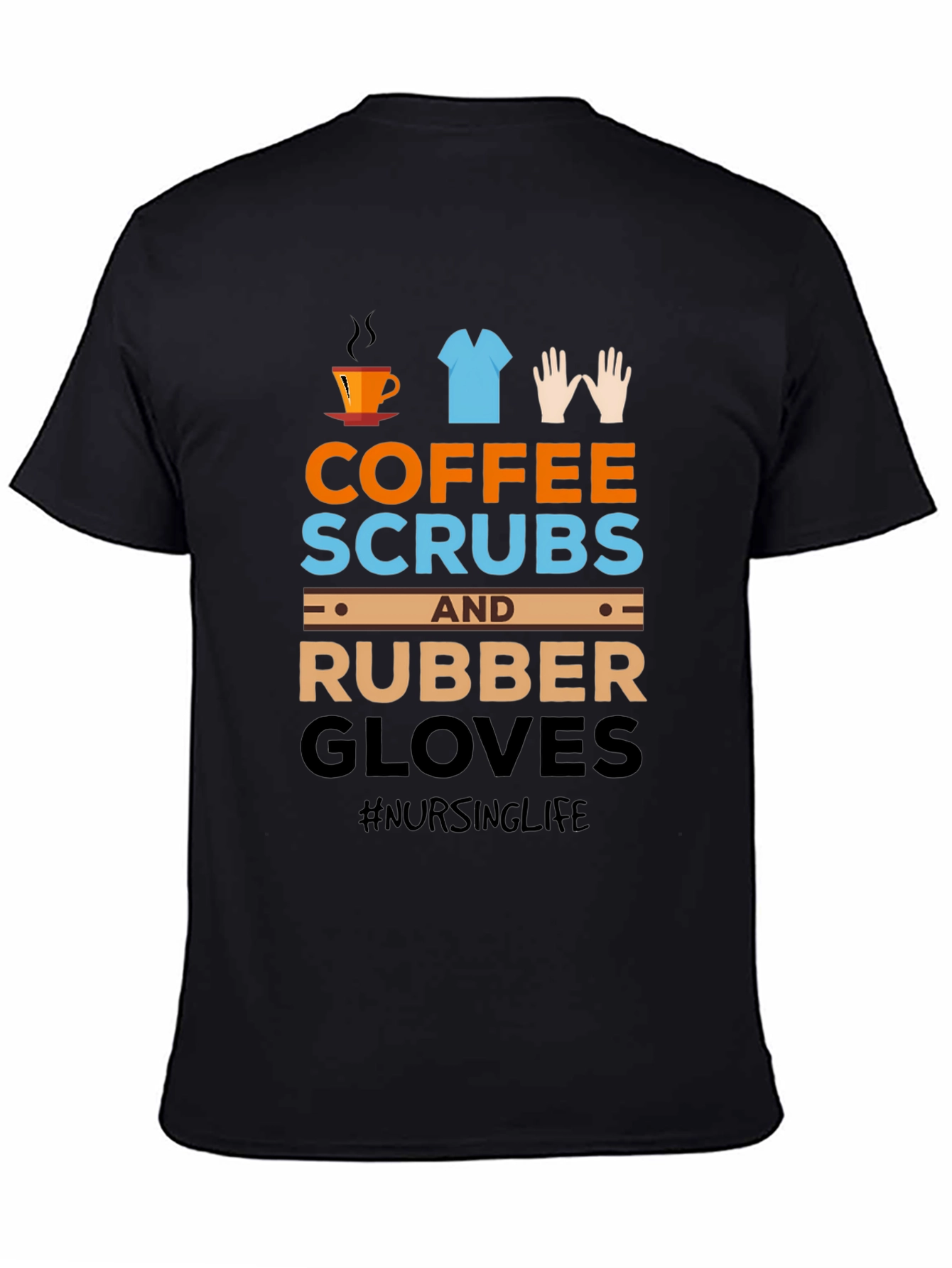 Show off your dedication to nursing with this fun and stylish t-shirt. This black tee features a playful design with symbols for coffee, scrubs, and rubber gloves. The phrases "Coffee, Scrubs" and "Rubber Gloves" are stacked in contrasting fonts. This shirt is perfect for nurses, nursing students, or anyone who appreciates the hard work and dedication of healthcare professionals. Wear it to work, school, or casual outings to express your pride. Made from comfortable materials, this tee is soft, breathable, and built for everyday wear. Get yours today and wear your passion!