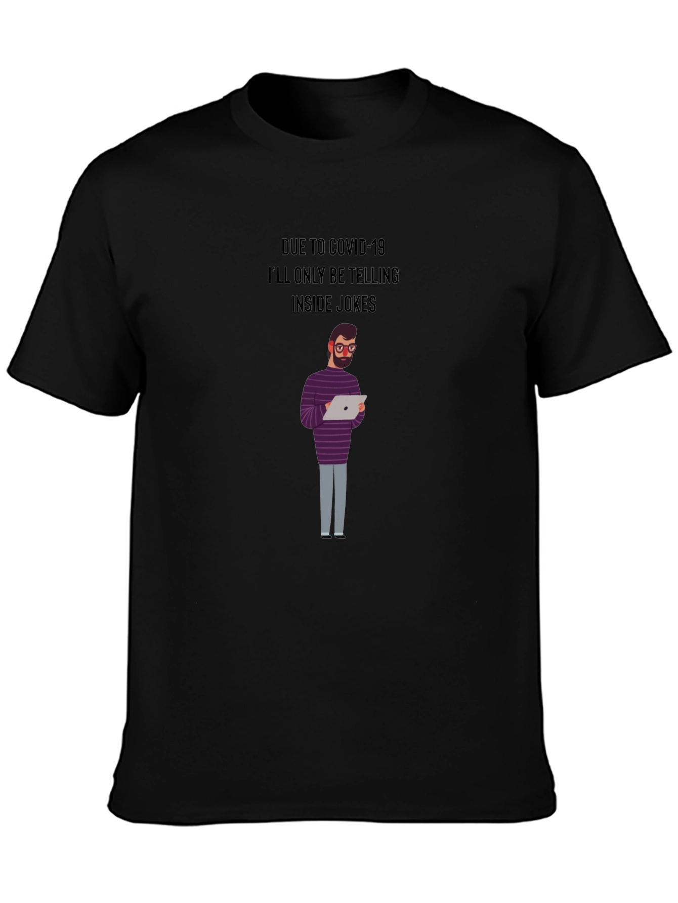This black t-shirt features a humorous graphic that is perfect for lighthearted individuals. The design includes the phrase "DUE TO COVID-19 I'LL ONLY BE TELLING INSIDE JOKES" accompanied by a cartoon figure looking at a tablet or book. The wearer will be expressing that they are ready to get back into social circles and crack those inside jokes once again! Made from a comfortable-looking material, this tee appears to be casual and easy to wear. Great for everyday wear, casual hangouts, or even a fun Zoom call. It's a great way to showcase your sense of humor and spark conversations.