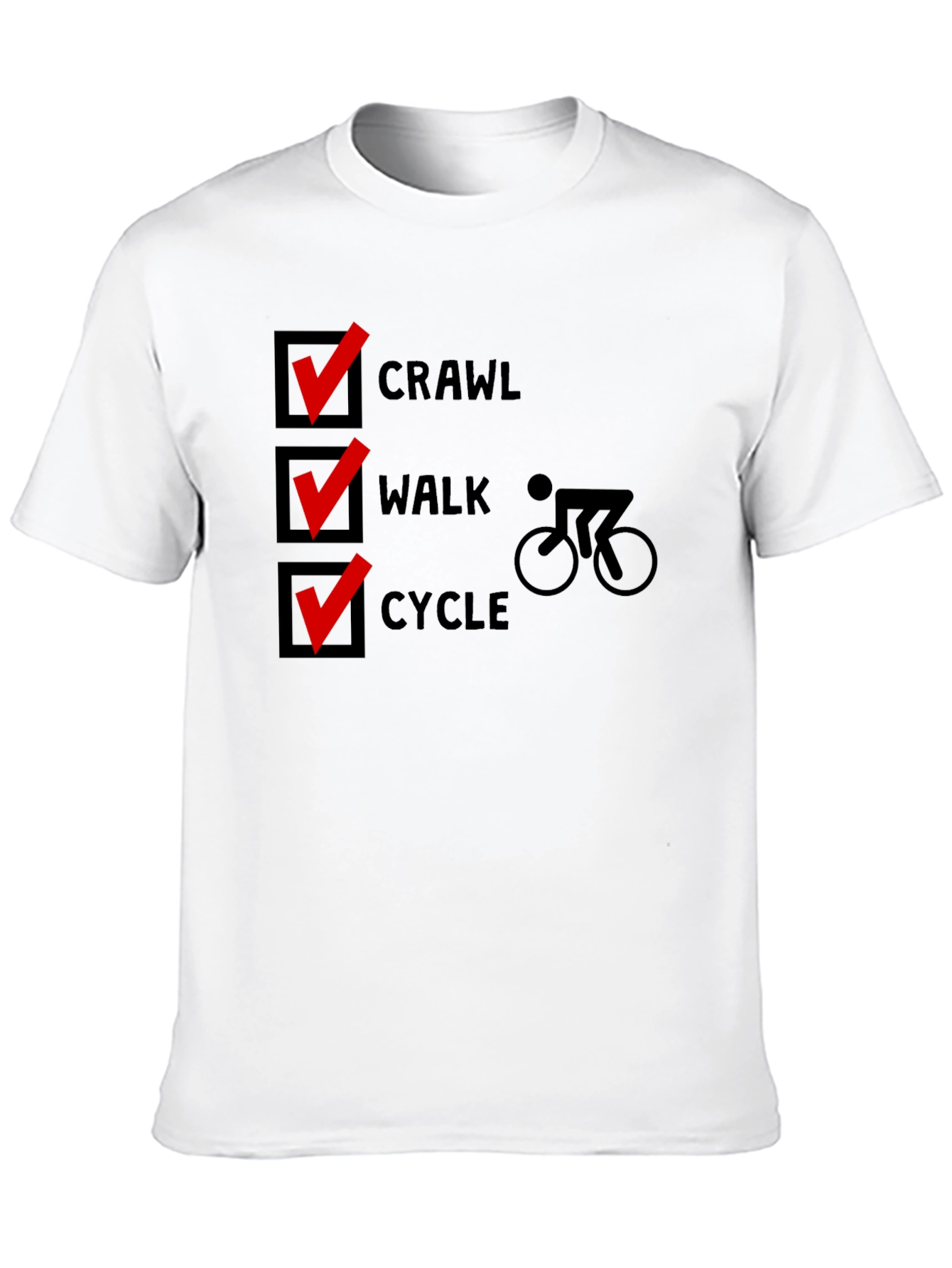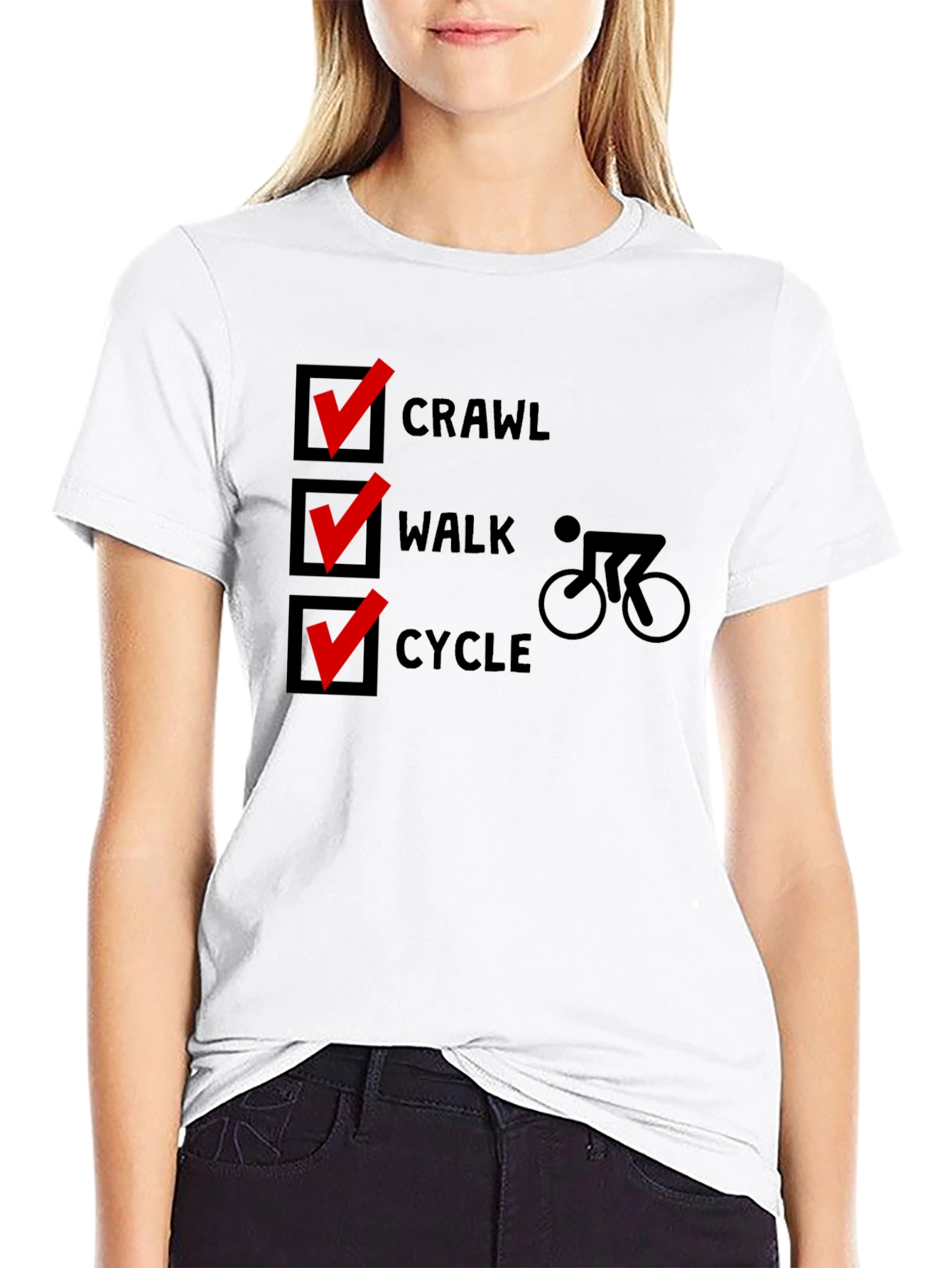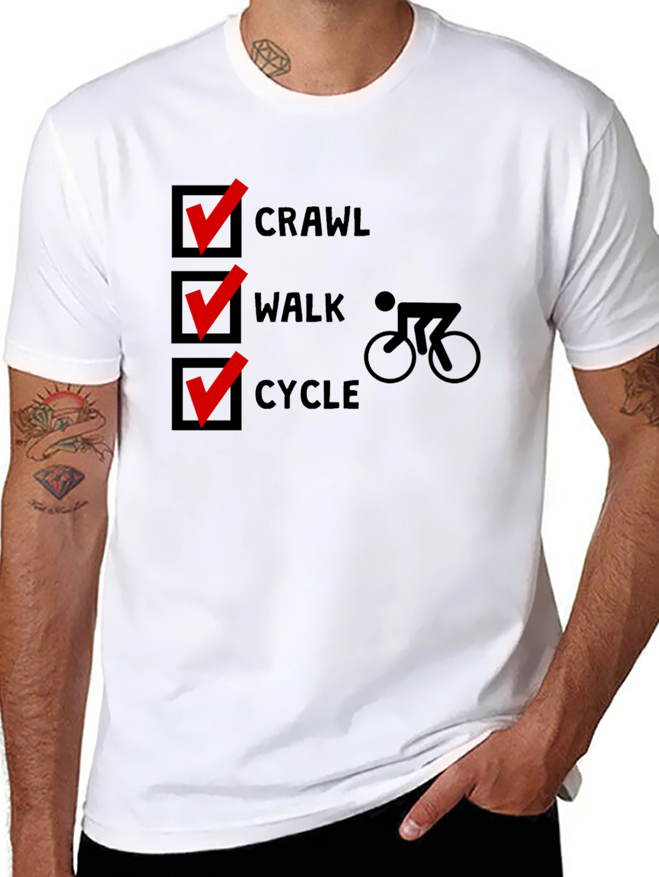 Show off your love for fitness with this stylish black T-shirt! The design features a playful 'Crawl, Walk, Cycle' checklist graphic with bold red checkmarks. A cycling icon adds a sporty touch, making it perfect for cyclists and fitness enthusiasts. Crafted from a comfortable material, this tee is ideal for casual wear or workouts. Get ready to turn heads at the gym or on your next bike ride. This sporty tee combines comfort and style effortlessly. Make a statement about your active lifestyle and grab yours today!