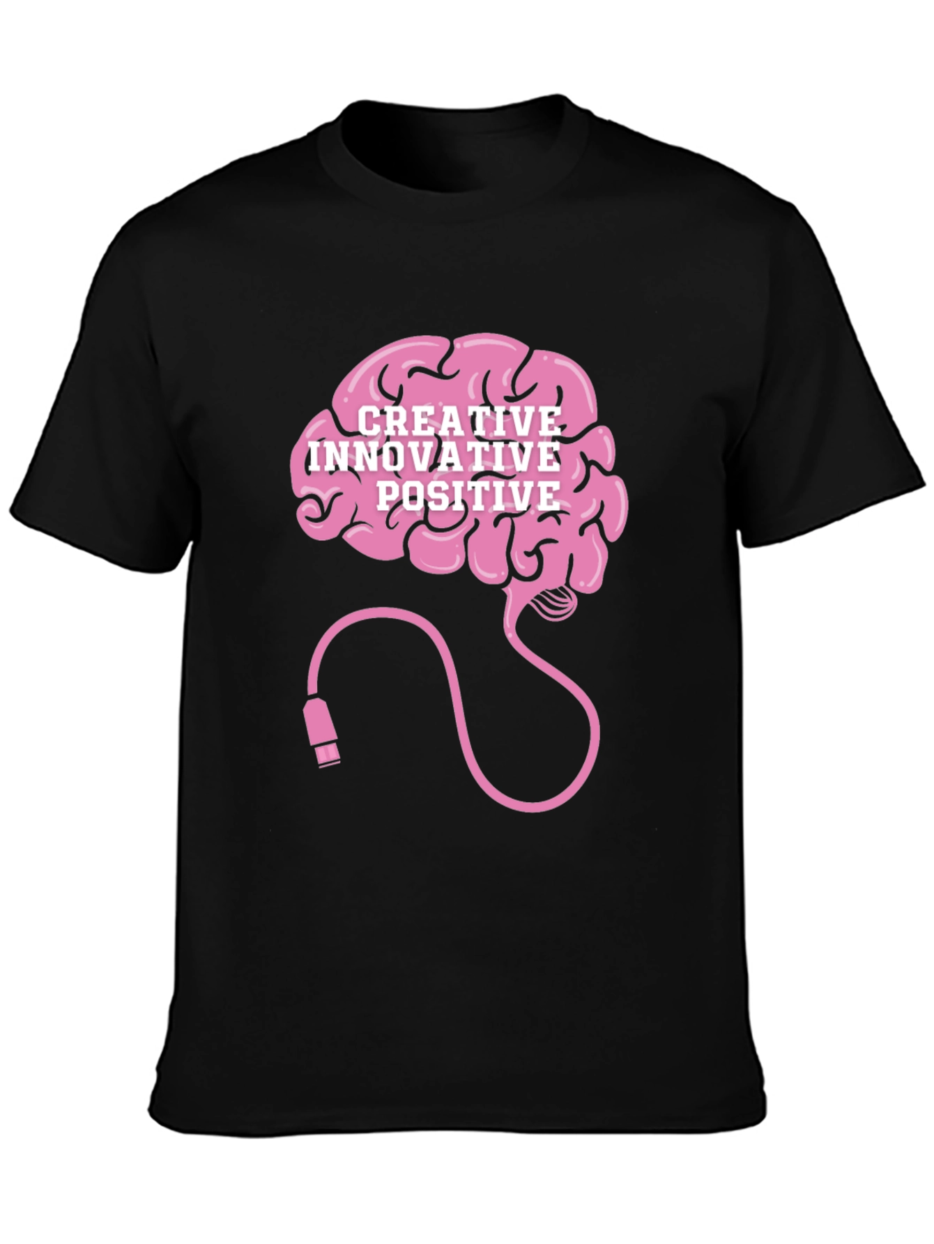 Showcase your creative spirit with this unique graphic tee! The black t-shirt features a pink brain design connected with a cord, emphasizing the power of innovation. The words "Creative, Innovative, Positive" are integrated into the brain illustration, promoting a message of forward-thinking and optimism. Perfect for artists, thinkers, and anyone who values inventive ideas. This eye-catching tee is made from comfortable fabric, ensuring both style and wearability. Ideal for casual outings, creative workshops, or simply expressing your imaginative mindset.