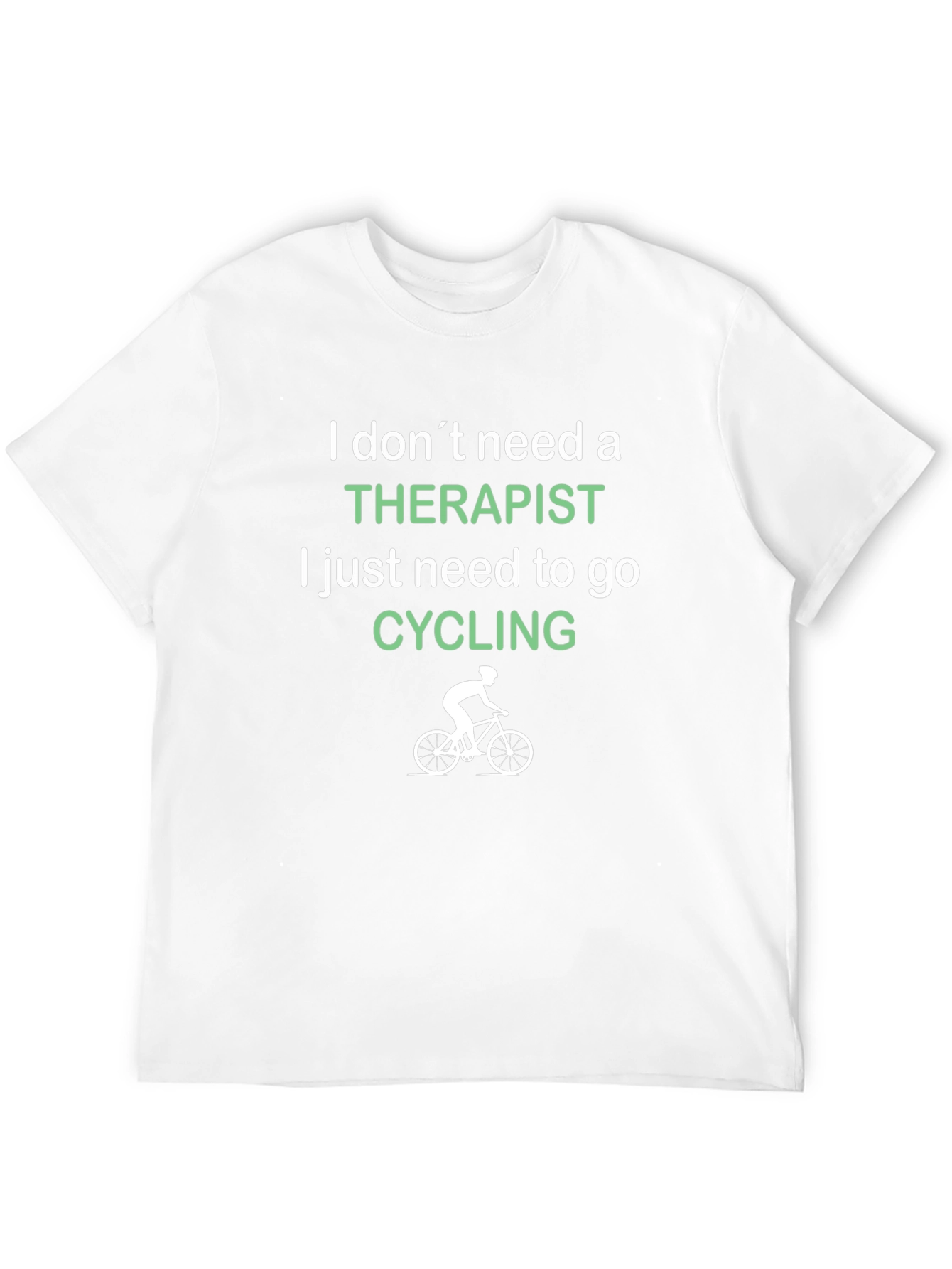This classic fit black t-shirt boldly declares the wearer's preference for cycling as a form of therapy. The humorous message, "I don't need a THERAPIST, I just need to go CYCLING," is printed in white and green lettering across the chest. A minimalist cyclist silhouette is printed below the text. Made from what appears to be a soft, comfortable cotton blend, this tee is perfect for casual wear, bike rides, or as a gift for the cycling enthusiast in your life. Show off your passion for cycling and make a statement with this eye-catching t-shirt.