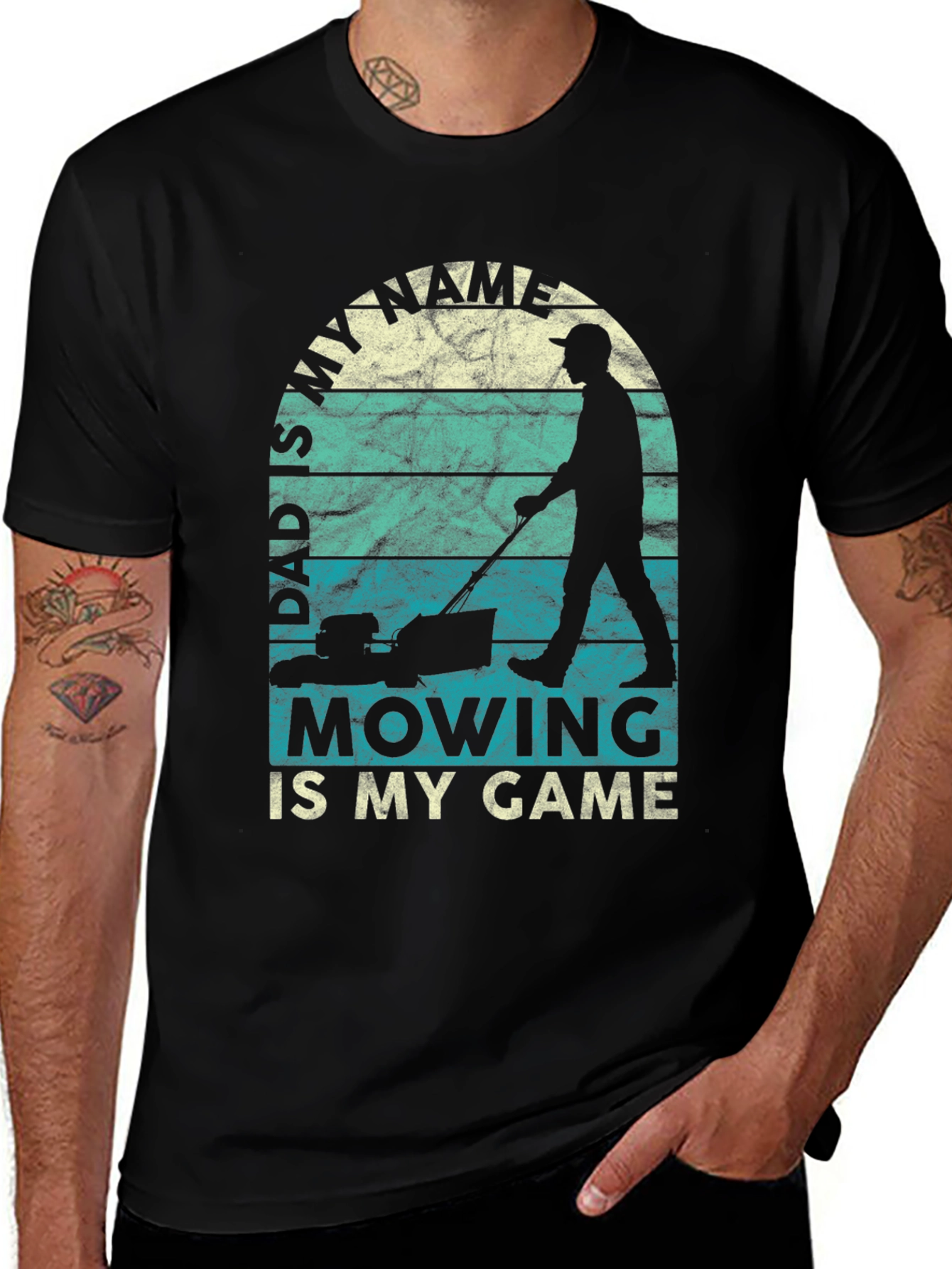 Show off your love for lawn care with this unique graphic tee! This black t-shirt features a vintage-style design with the phrase "Dad's My Name, Mowing Is My Game" printed above and below a silhouetted image of a person mowing the lawn against a blue and beige striped backdrop. The shirt is made of a soft, comfortable fabric perfect for everyday wear. This t-shirt is sure to make a statement whether you're out mowing the lawn or just relaxing on the weekend. Perfect for the Dad who takes pride in his lawn!