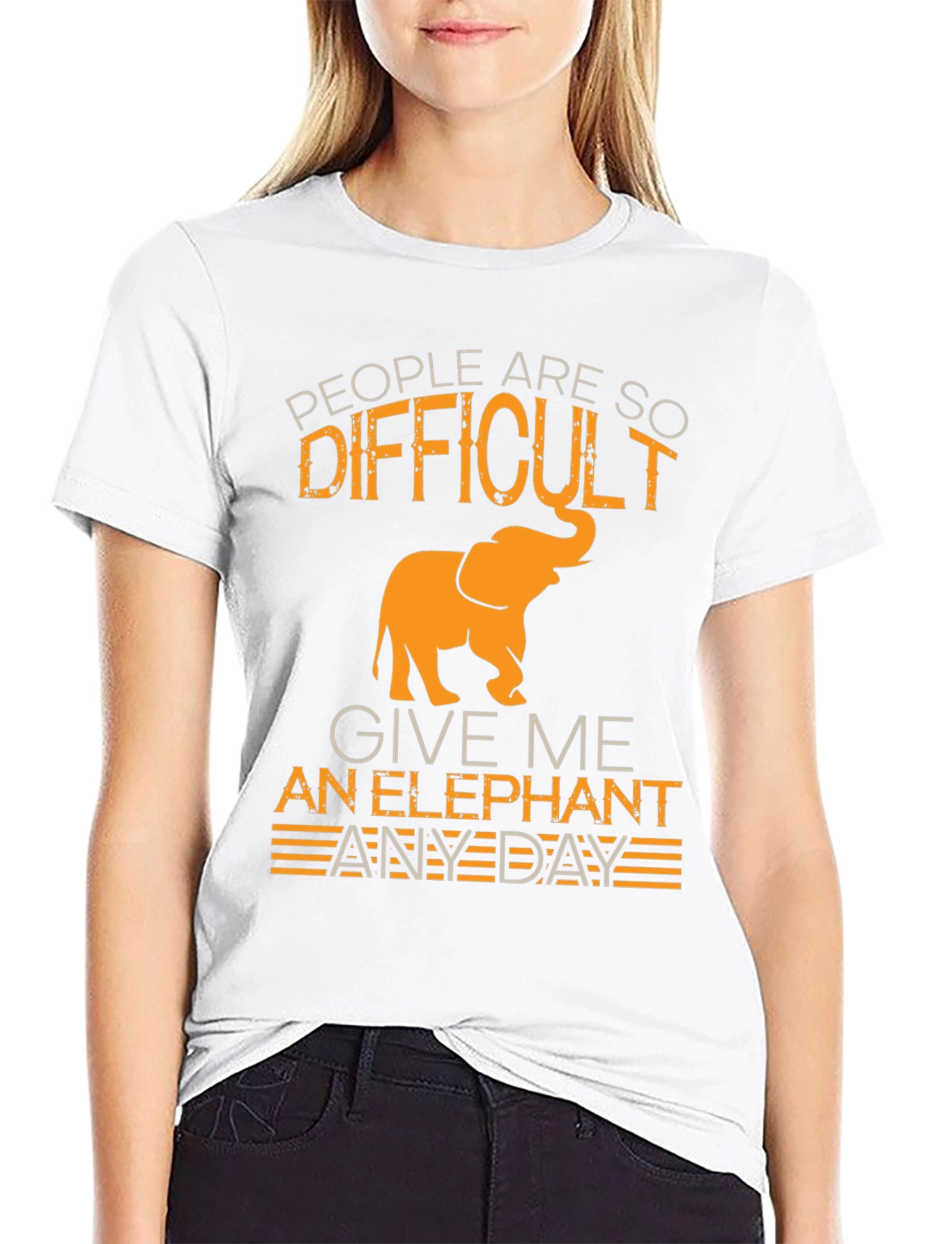 This black t-shirt features a humorous graphic design. The text, in a distressed orange font, reads, "PEOPLE ARE SO DIFFICULT GIVE ME AN ELEPHANT ANYDAY," sandwiching a silhouette of a cute elephant. Perfect for elephant lovers or anyone who prefers the company of animals to humans! Made from a comfortable-looking fabric, this tee is ideal for casual wear, animal rights events, or just expressing your unique personality. Grab yours today and show off your love for elephants!