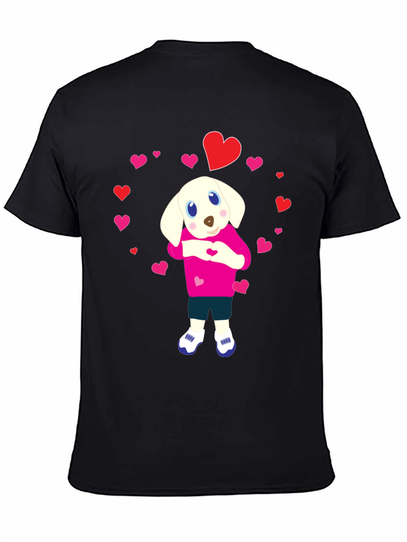 Show your love with this adorable black t-shirt featuring a charming puppy surrounded by hearts. The cute dog is wearing a pink sweater and making a heart shape with its hands. The design includes a mix of pink and red hearts that adds a touch of whimsy. Made from a soft, comfortable fabric, this t-shirt is perfect for casual wear or as a unique gift for dog lovers and Valentine's Day enthusiasts. Its eye-catching design is sure to make you stand out and spread some puppy love wherever you go.