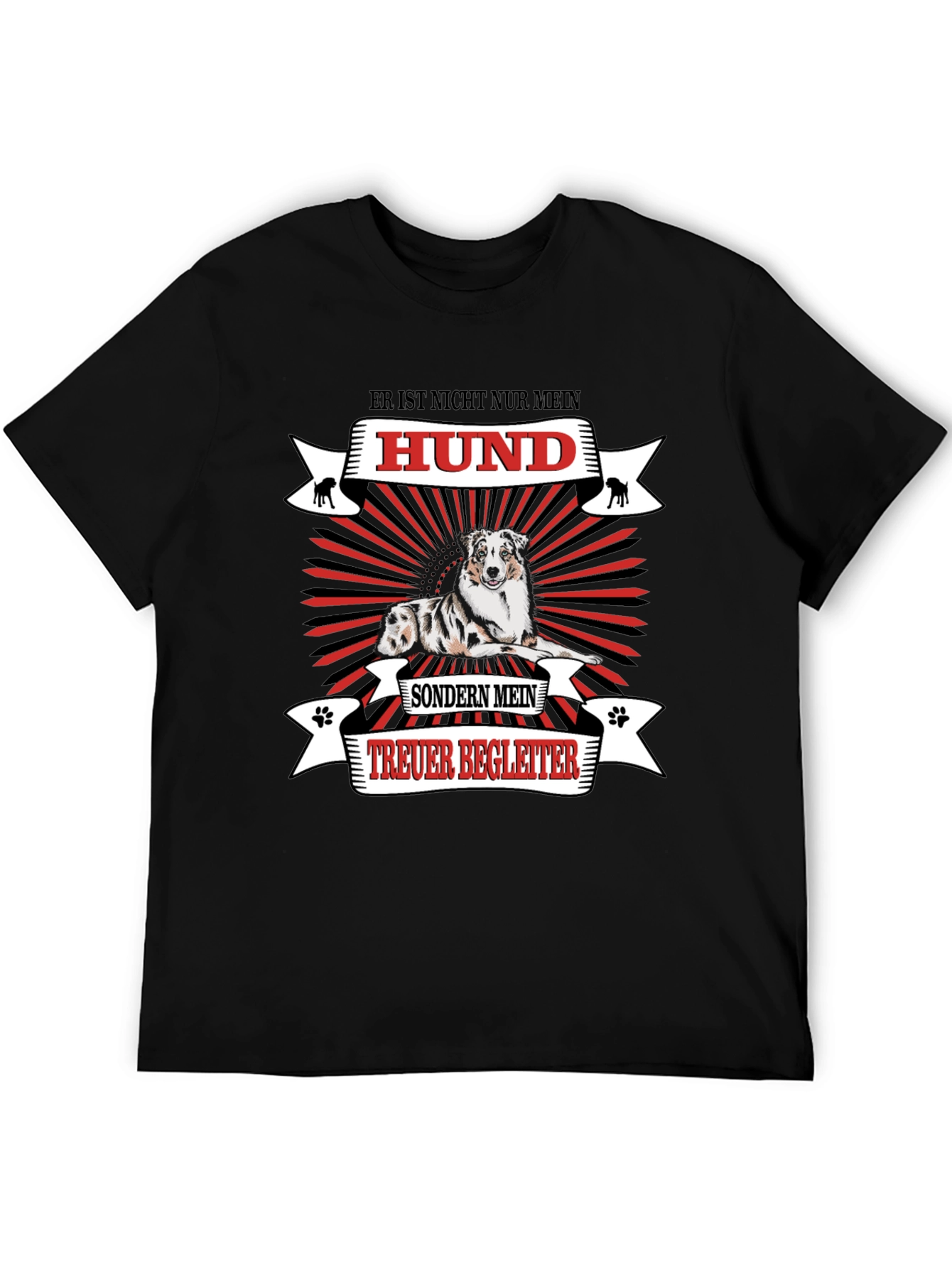 Show your love for your furry friend with this stylish black t-shirt. Featuring a unique graphic design that reads "Er ist nicht nur mein Hund sondern mein treuer Begleiter" (He is not only my dog but my loyal companion), this tee is perfect for any dog owner. The shirt displays an Australian Shepherd dog in a striking central image, accented by banner designs and paw print details. Made from comfortable, breathable fabric, it’s ideal for everyday wear, dog walks, or casual outings. A perfect gift for the dog-loving person in your life!
