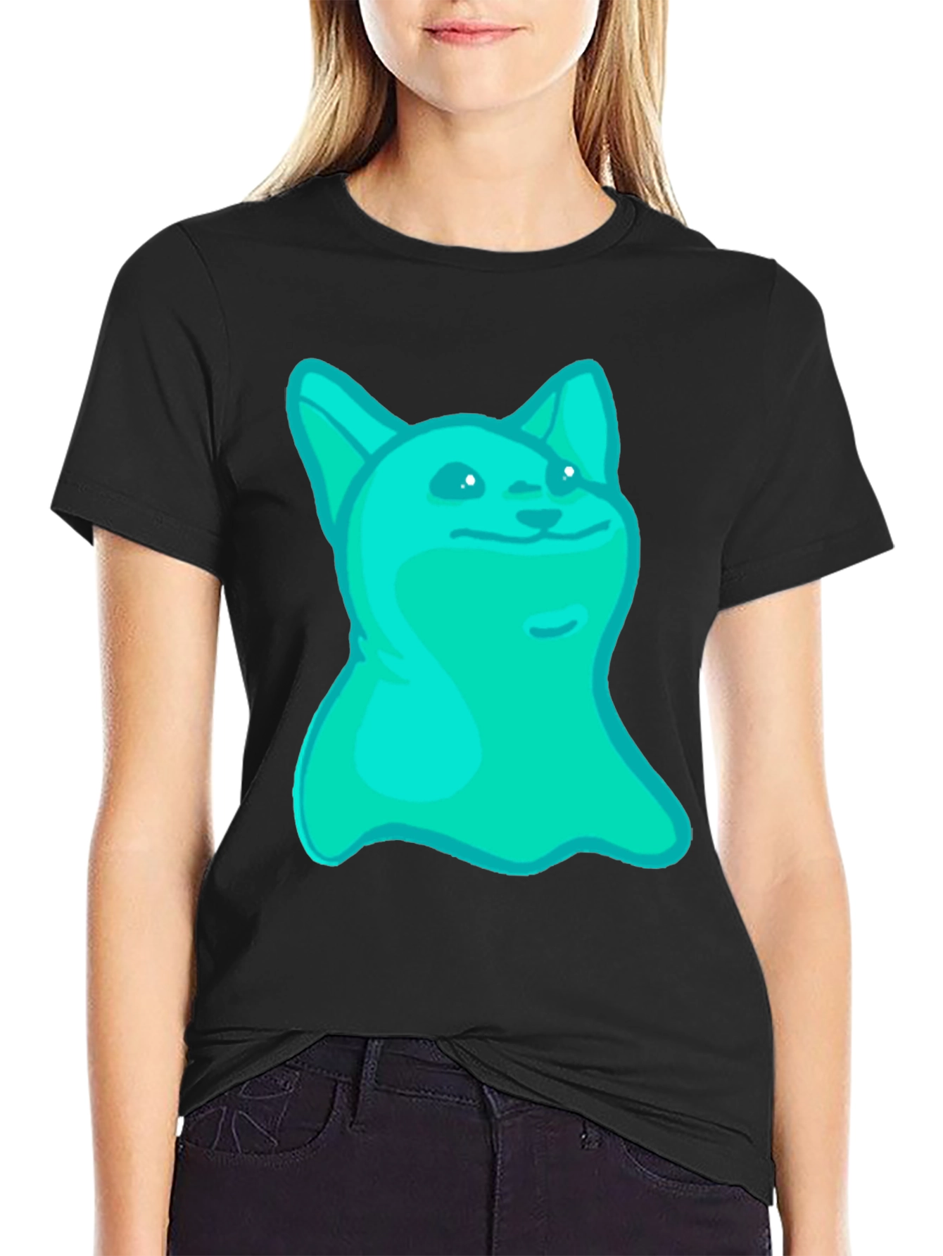 Show off your love for internet culture with this unique black T-shirt. Featuring a bold and eye-catching design, this tee is sure to turn heads. The graphic showcases a stylized doge meme in a vibrant teal color, adding a playful and humorous touch to your outfit. Made from a comfortable and breathable fabric, this T-shirt is perfect for everyday wear. The classic crew neck and short sleeve design make it a versatile addition to your wardrobe, easily paired with jeans, shorts, or casual pants. Ideal for casual outings, meme enthusiasts, or anyone who enjoys expressing their personality through fashion. Get ready to make a statement with this must-have graphic tee!