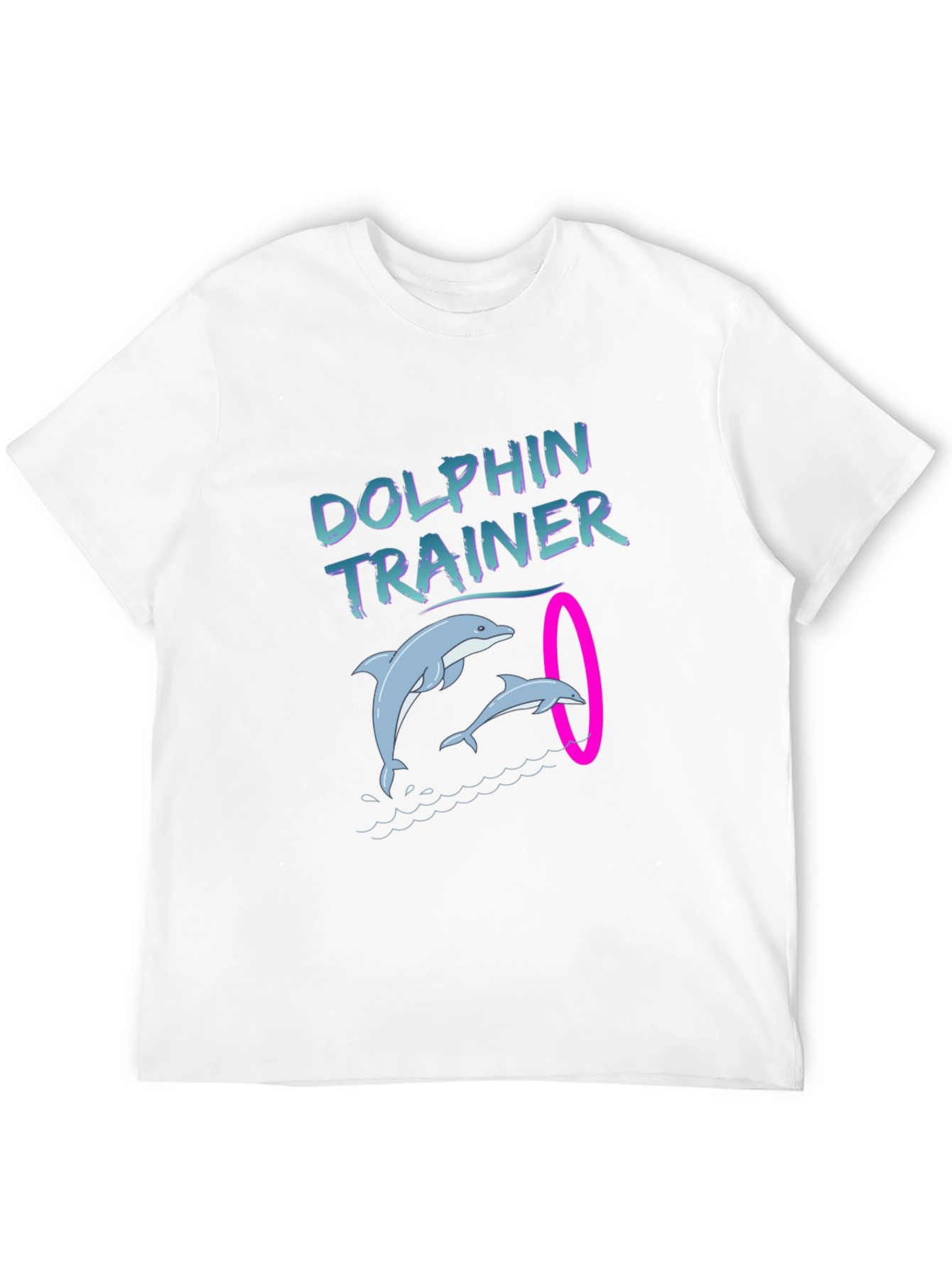 Dive into style with this eye-catching black T-shirt! Featuring a playful design of two dolphins leaping through a hoop, accompanied by the words "DOLPHIN TRAINER" in a vibrant, slightly distressed font. Perfect for animal lovers and marine enthusiasts, this tee combines comfort and fun. Made from a soft-looking fabric, this shirt is ideal for everyday wear, casual outings, or themed events. Show off your passion for marine life with this unique and comfortable T-shirt. A great addition to any wardrobe!