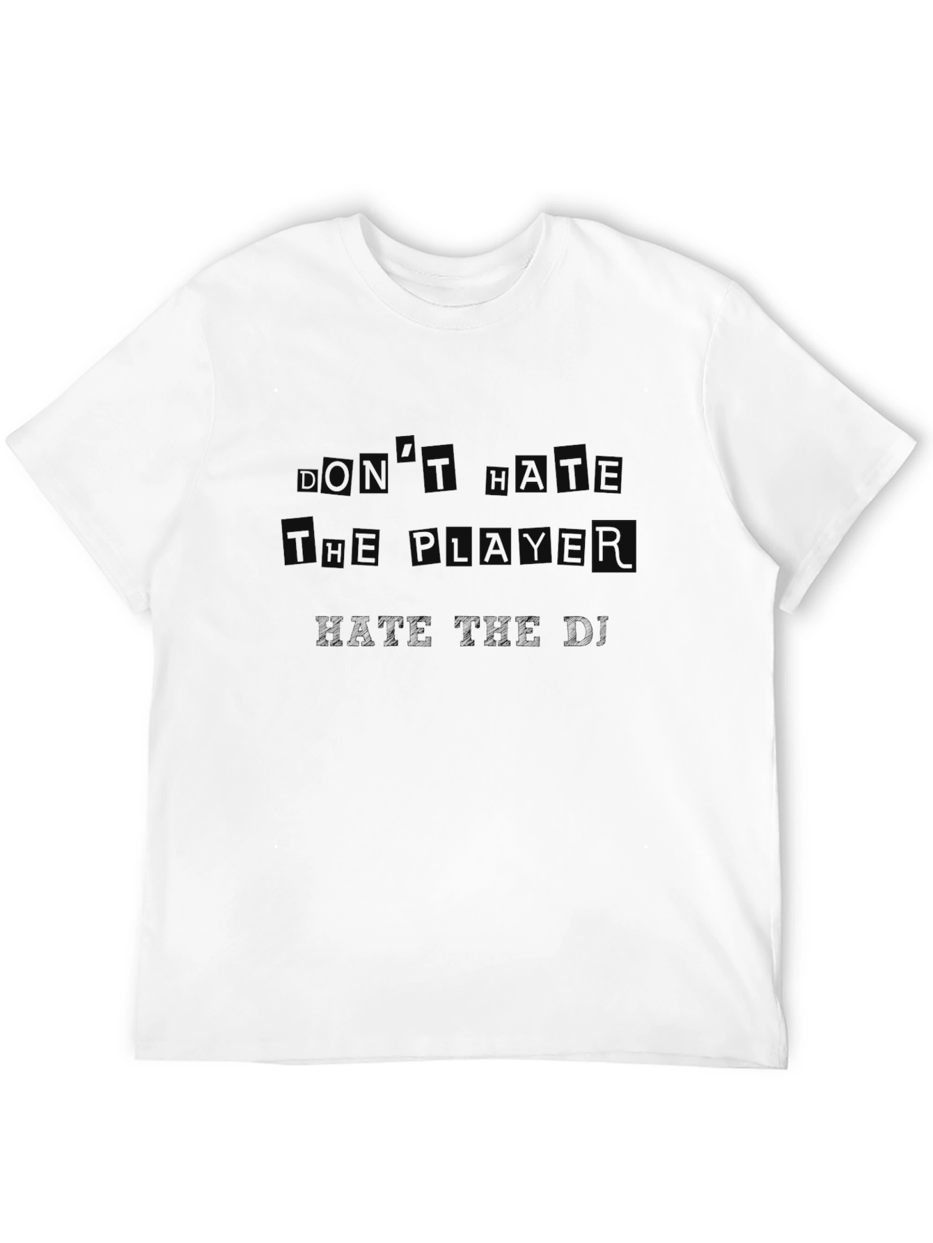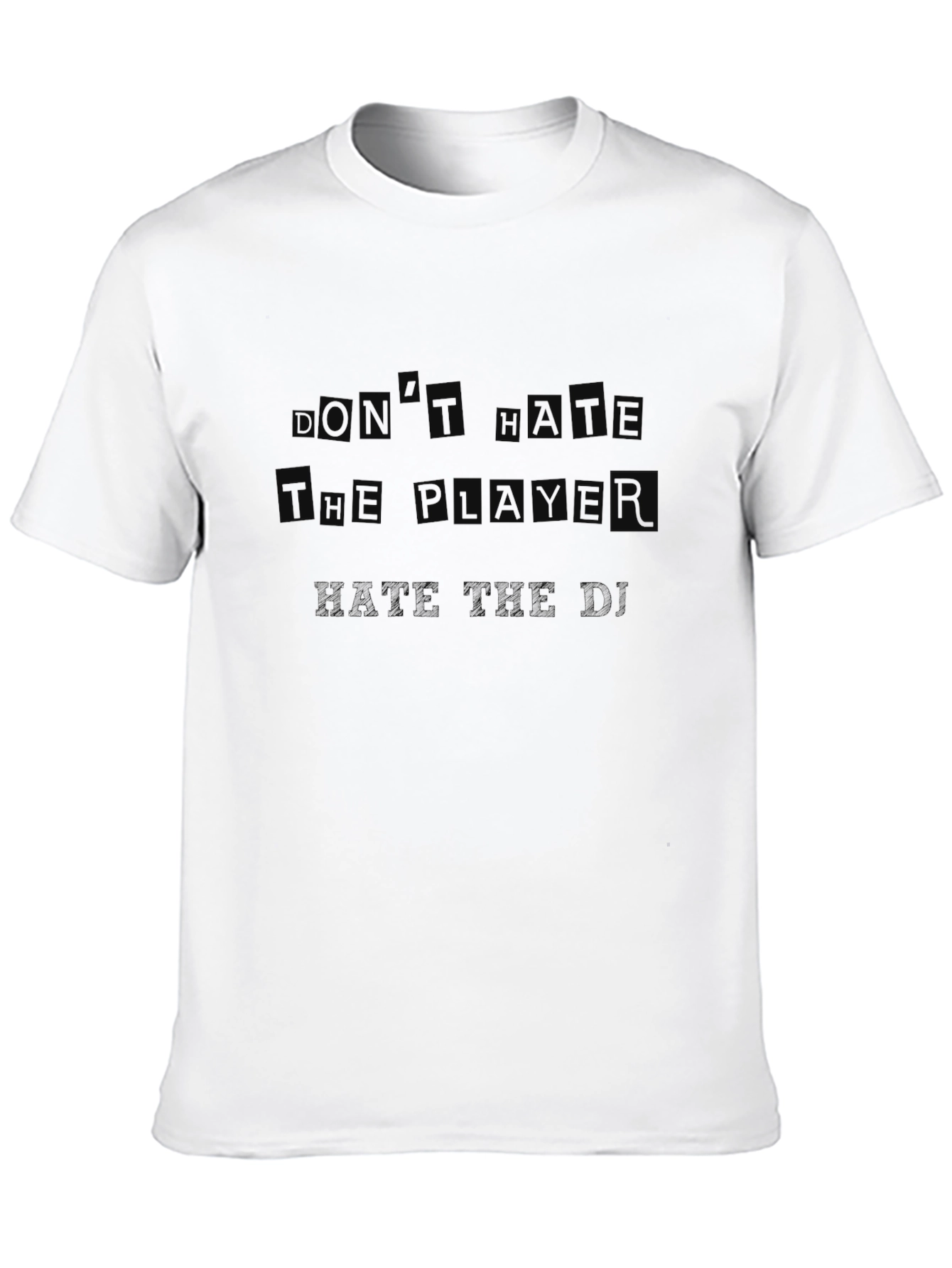This stylish black t-shirt features the popular phrase "Don't Hate The Player, Hate The Game" printed across the chest. Made from a comfortable, soft fabric, this tee is perfect for casual wear. The message is displayed in a subtle, matching black font, giving it a sleek and understated look. The classic fit makes it a versatile addition to any wardrobe. Ideal for expressing your unique style, this t-shirt can be paired with jeans, shorts, or layered under a jacket for a trendy look. Show off your playful side with this eye-catching tee!