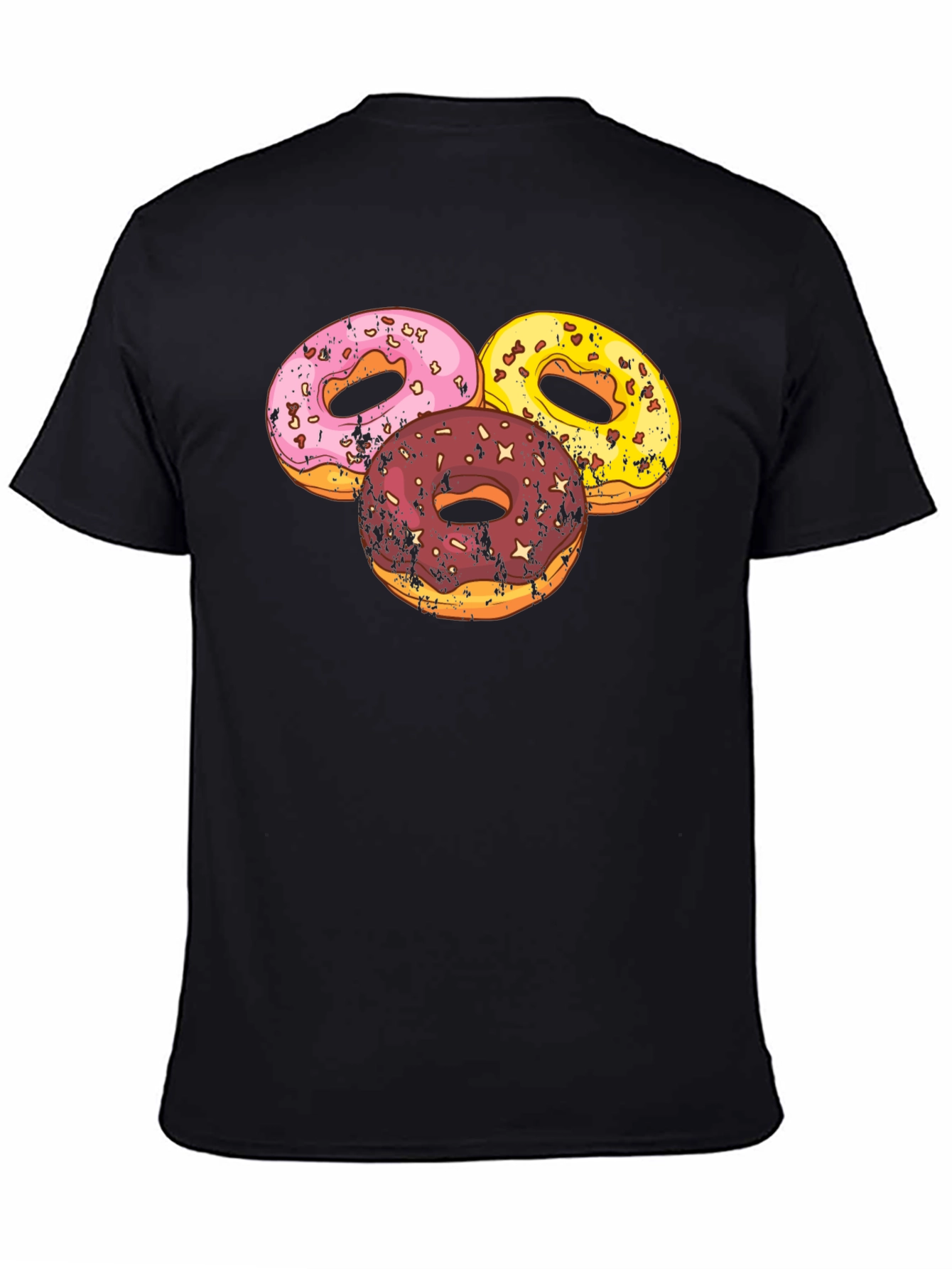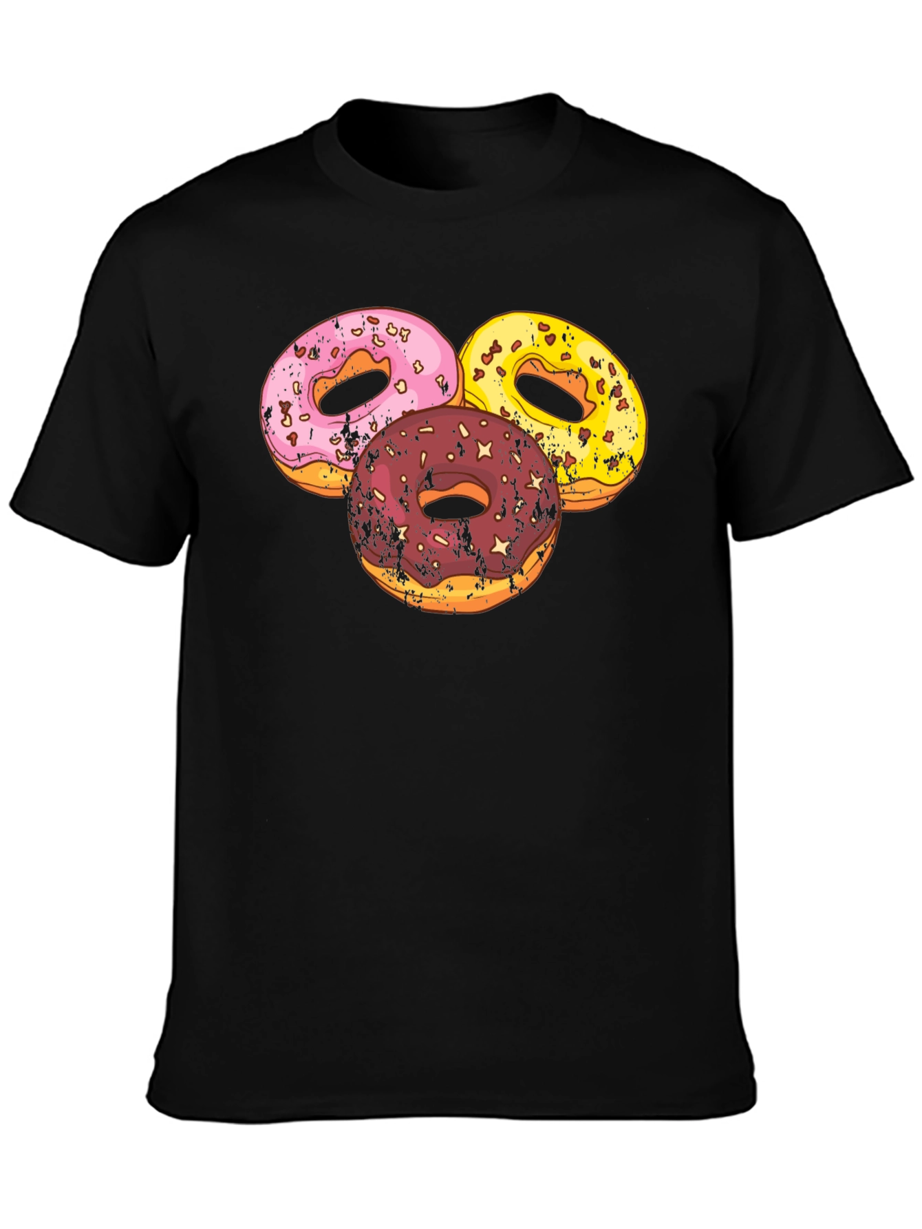 Indulge your love for sweets with this fun and stylish black t-shirt. Featuring a trio of delicious-looking donuts – pink, chocolate, and yellow frosted – this shirt is a playful statement piece. The vibrant, cartoon-style donut design is eye-catching and adds a pop of color to any outfit. Crafted from a comfortable fabric, it's perfect for casual outings, lounging at home, or expressing your unique personality. Show off your sweet side with this must-have donut t-shirt that's sure to turn heads and spark conversations. Ideal for donut enthusiasts and anyone with a sense of humor, this shirt is a tasty addition to your wardrobe.