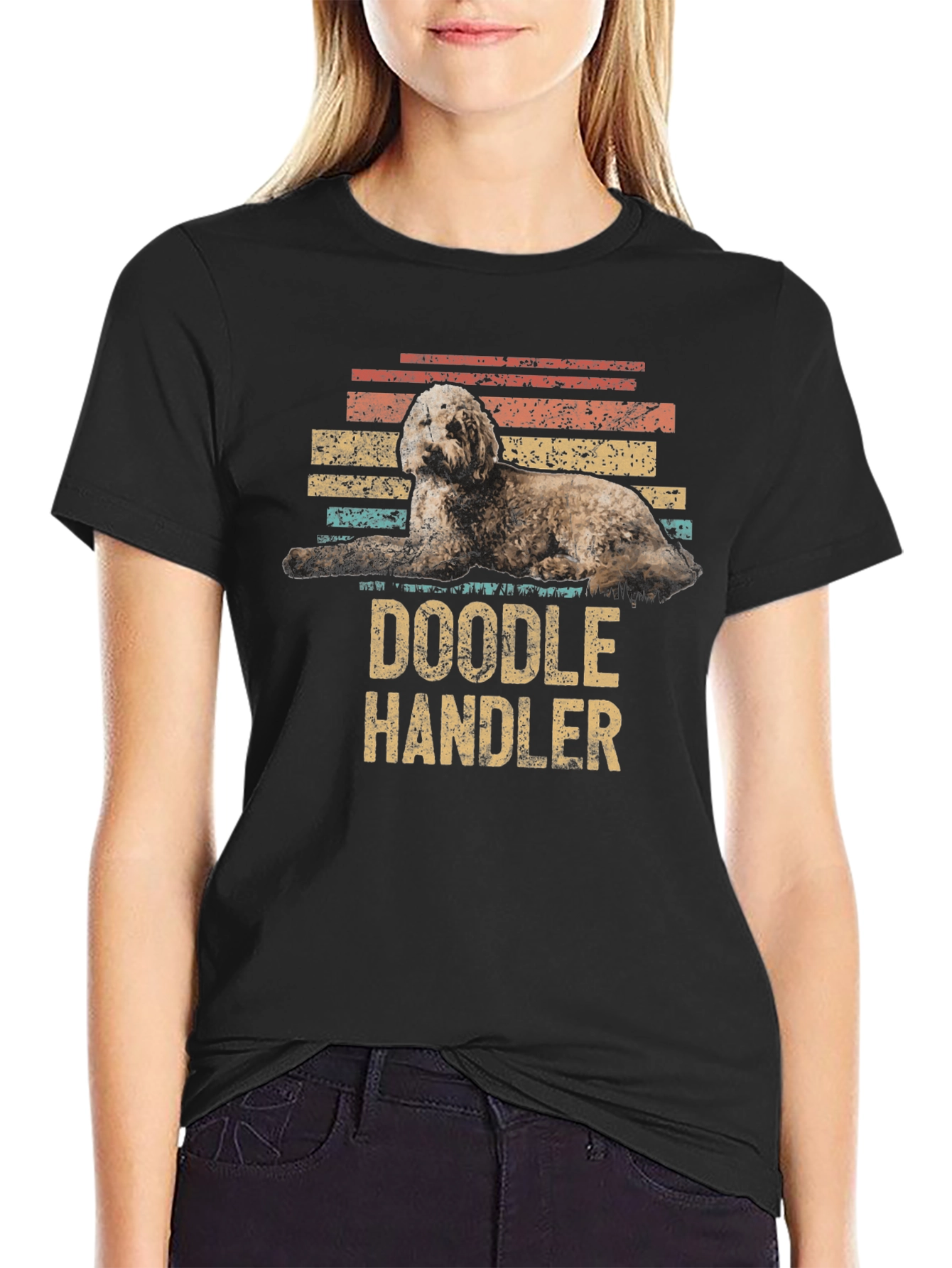 Show your love for your furry friend with this stylish and comfortable Doodle Handler T-Shirt. Crafted from a soft, breathable black fabric, this tee features a vintage-inspired design with a cute doodle dog graphic layered on top of distressed color stripes. The bold "DOODLE HANDLER" text adds a playful touch. Perfect for casual outings, dog walks, or lounging at home, this t-shirt is a great way to express your passion for your Goldendoodle or Labradoodle. A great gift for any dog owner!