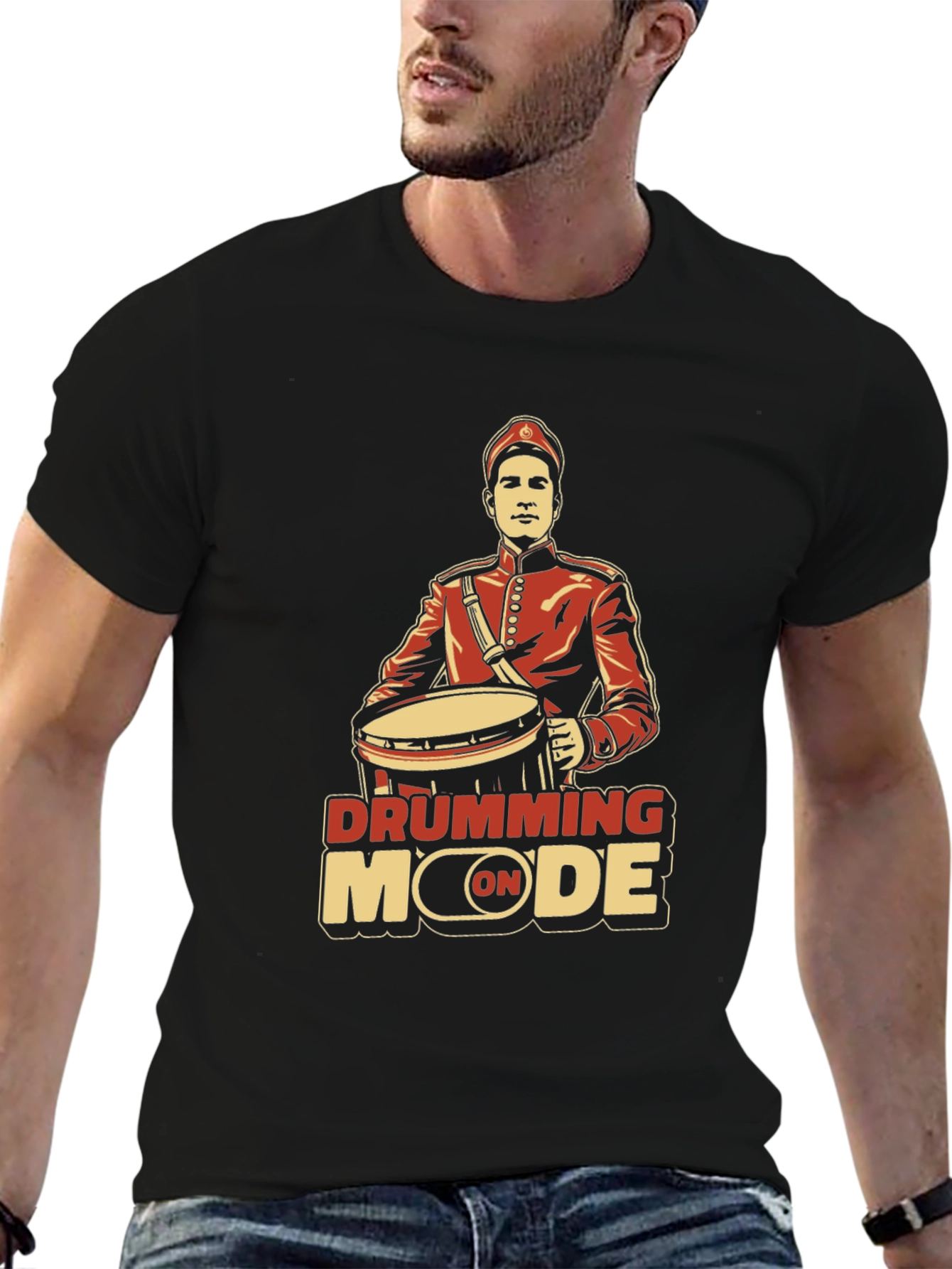 Show your love for drumming with this eye-catching graphic t-shirt! Featuring a unique design of a drummer in a vintage-inspired style, this tee is sure to turn heads. The "Drumming Mode On" text adds a playful touch. Made from a comfortable, breathable fabric, this t-shirt is perfect for casual wear, music events, or everyday style. Ideal for drummers, music lovers, or anyone who appreciates a cool and unique design. Available in black, this tee is a must-have addition to any wardrobe. Get yours today!