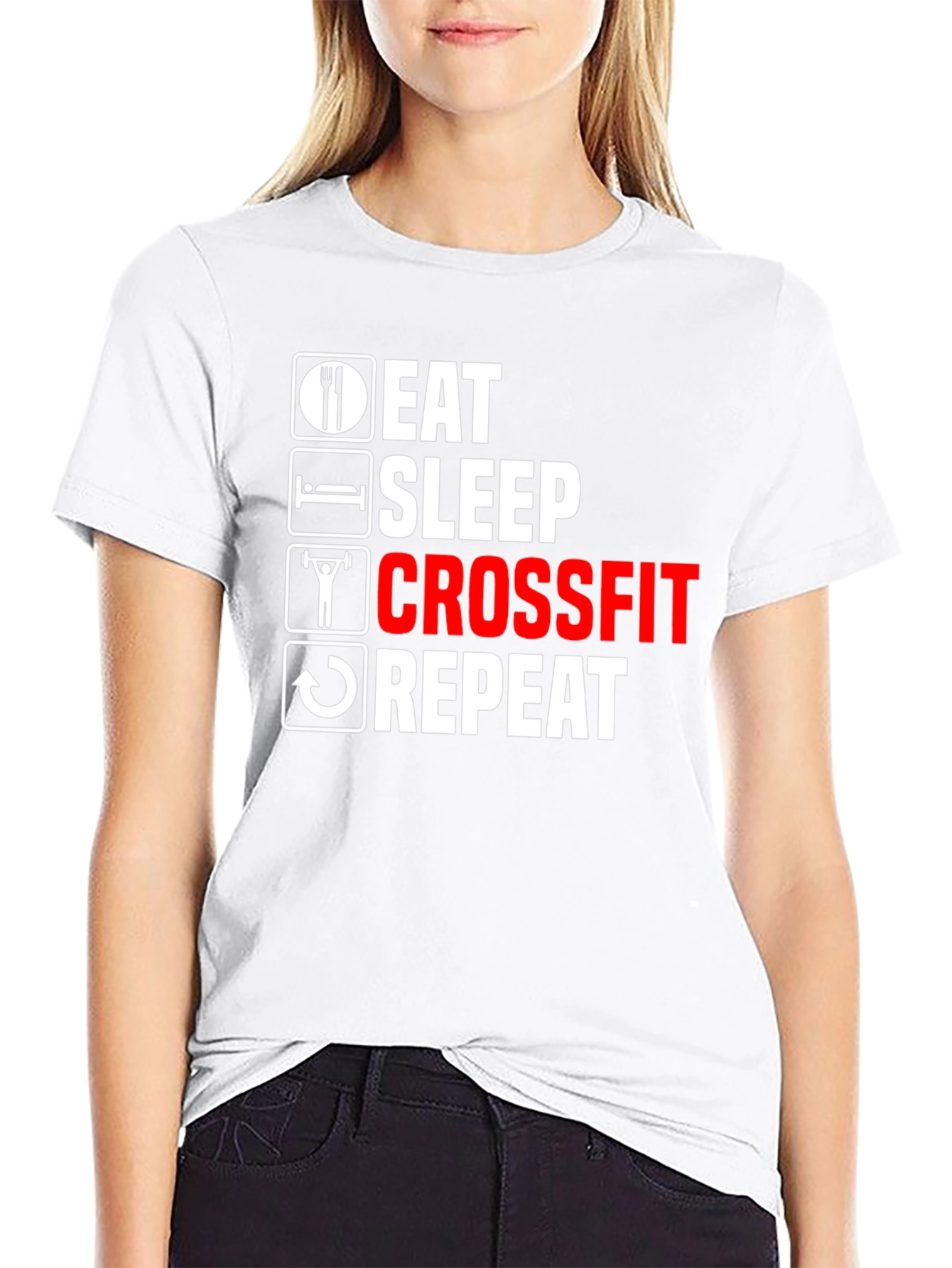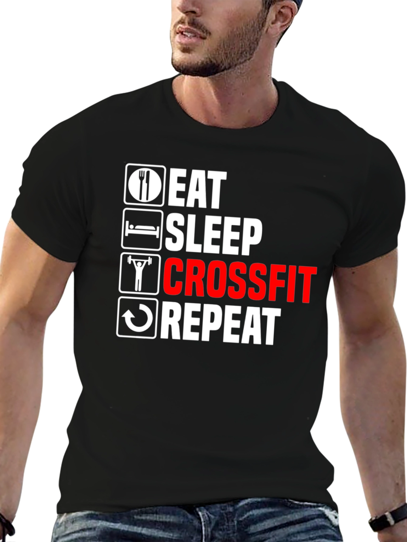 Show off your love for fitness with this eye-catching black t-shirt. Featuring the phrase "Eat Sleep Crossfit Repeat" in a striking white and red design, this tee is perfect for gym-goers and fitness enthusiasts alike. Made from comfortable, breathable material, it's ideal for workouts or casual wear. The bold graphic is sure to make a statement wherever you go. Whether you're hitting the gym, running errands, or just relaxing at home, this t-shirt is a must-have addition to your wardrobe. Get yours today and embrace the fitness lifestyle!